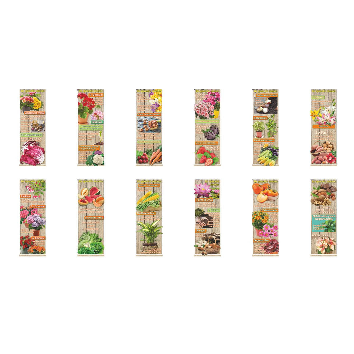 Calendario “Orto e Giardino. Trimestrale 12 fogli. Carta patinata. Testata pressofusa. Dimensioni: cm 28,8x47, testata cm 28,8x9. Imballo: 100