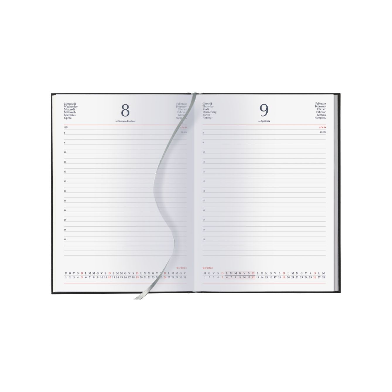 Interno giornaliero cartonato 17x24 - 396 pagine. - Carta usomano bianca 60gr - Sabato e Domenica separati. - Rubrica stampata, 4 pag. - Cartina geografica