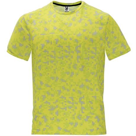 T-shirt tecnica stampata manica corta. Girocollo con copricuciture di rinforzo in contrasto nel colore giallo fluo. Pannelli laterali all´interno della manica e sulle spalle con rammagliato in tono.