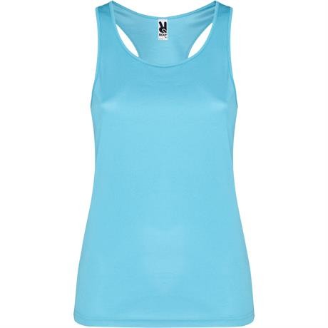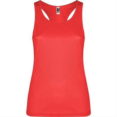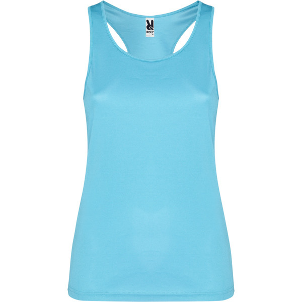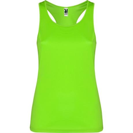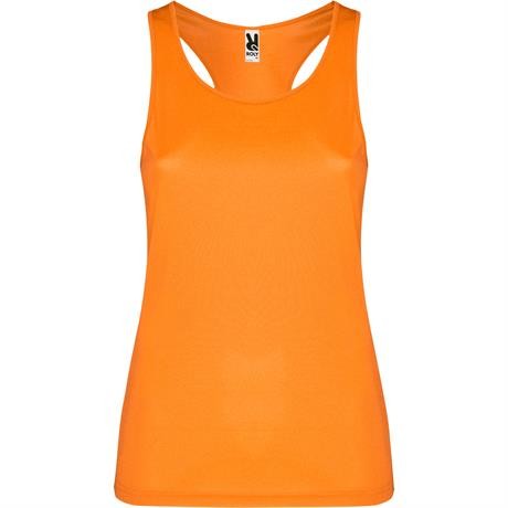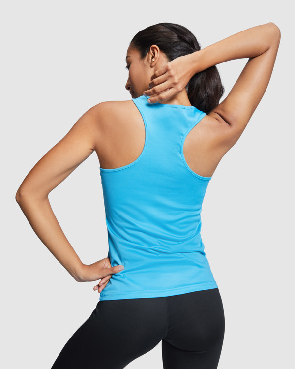 Canotta sportiva con giromanica e scollo doppia cucitura. Spalline incrociate sulla schiena e cuciture laterali.