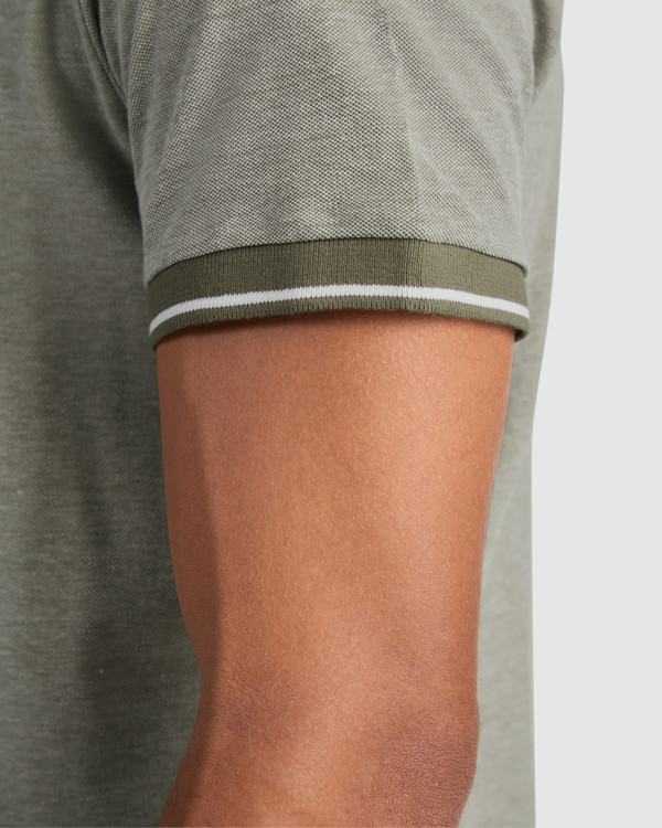 Polo vigorè manica corta. Collo in colore solido con costina 1x1 e dettaglio decorativo in contrasto. Abbotonatura con nastro decorativo in contrasto e tre bottoni. Giromanica con dettagli in contrasto. Parte inferiore con aperture laterali e nastro decorativo. La parte posteriore è leggermente più lunga della parte frontale.