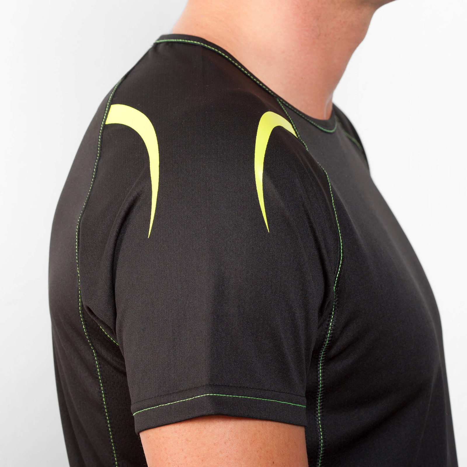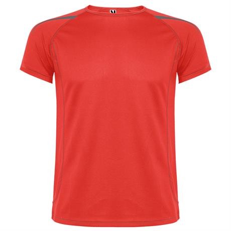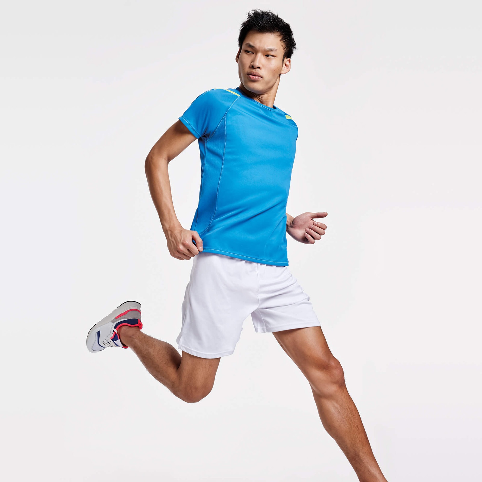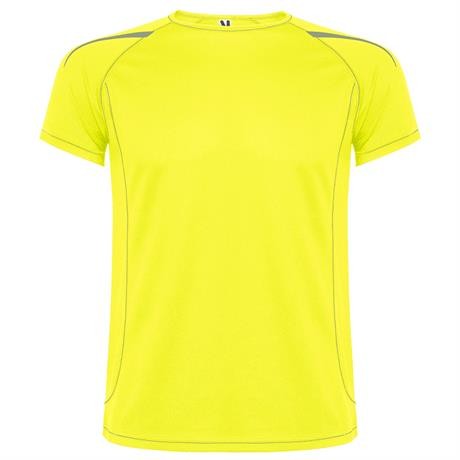 Maglietta tecnica manica corta raglan con doppio tessuto. 1.-Cuciture in contrasto su fondo manica, girovita, collo e fianchi. 2.-Collo in contrasto con lo stesso tessuto. 3.-Tessuto traspirante, di facile lavaggio e asciugatura rapida. 4. - Dettagli riflettenti, tranne nei colori nero e royal. In queste tonalità il dettaglio è in giallo non riflettente.