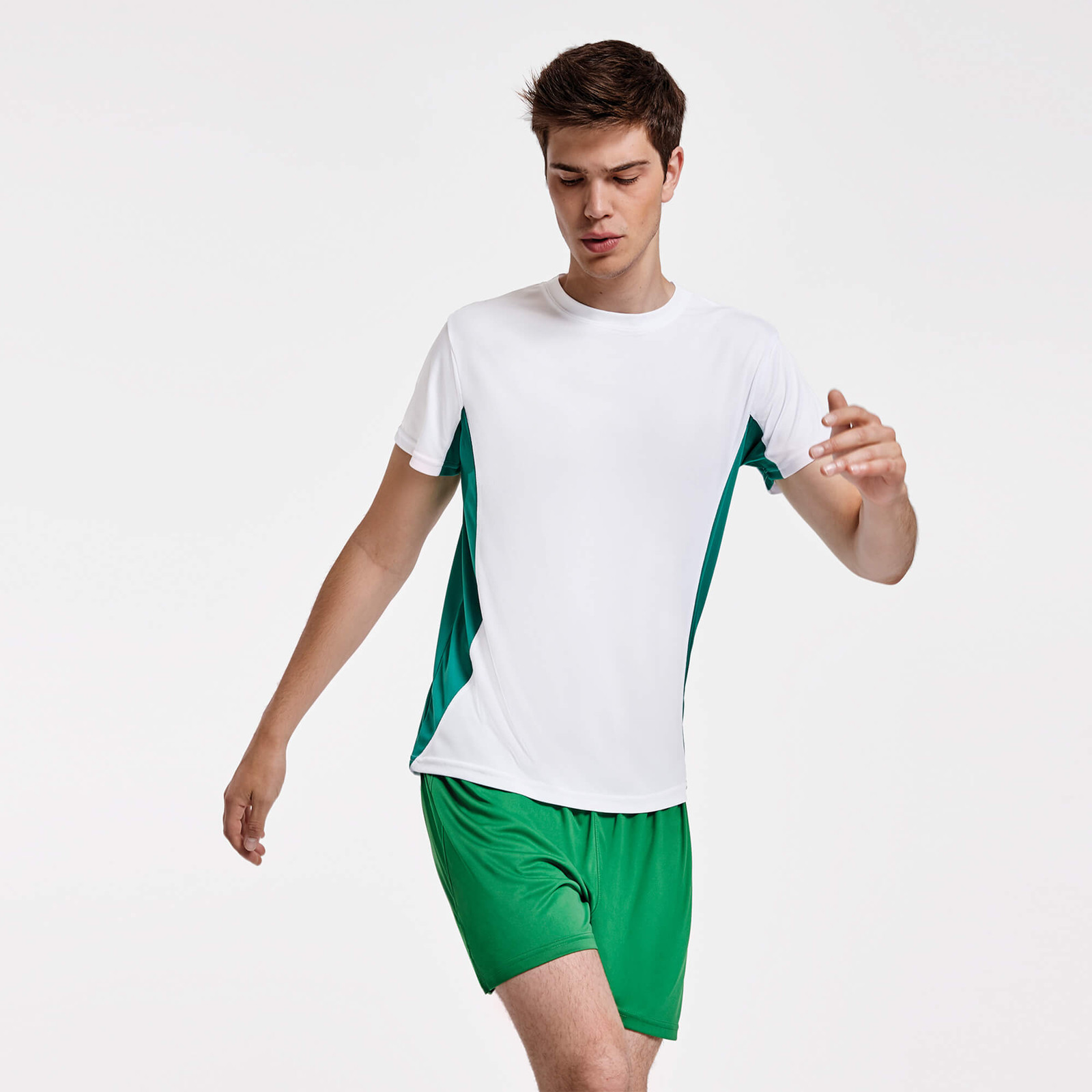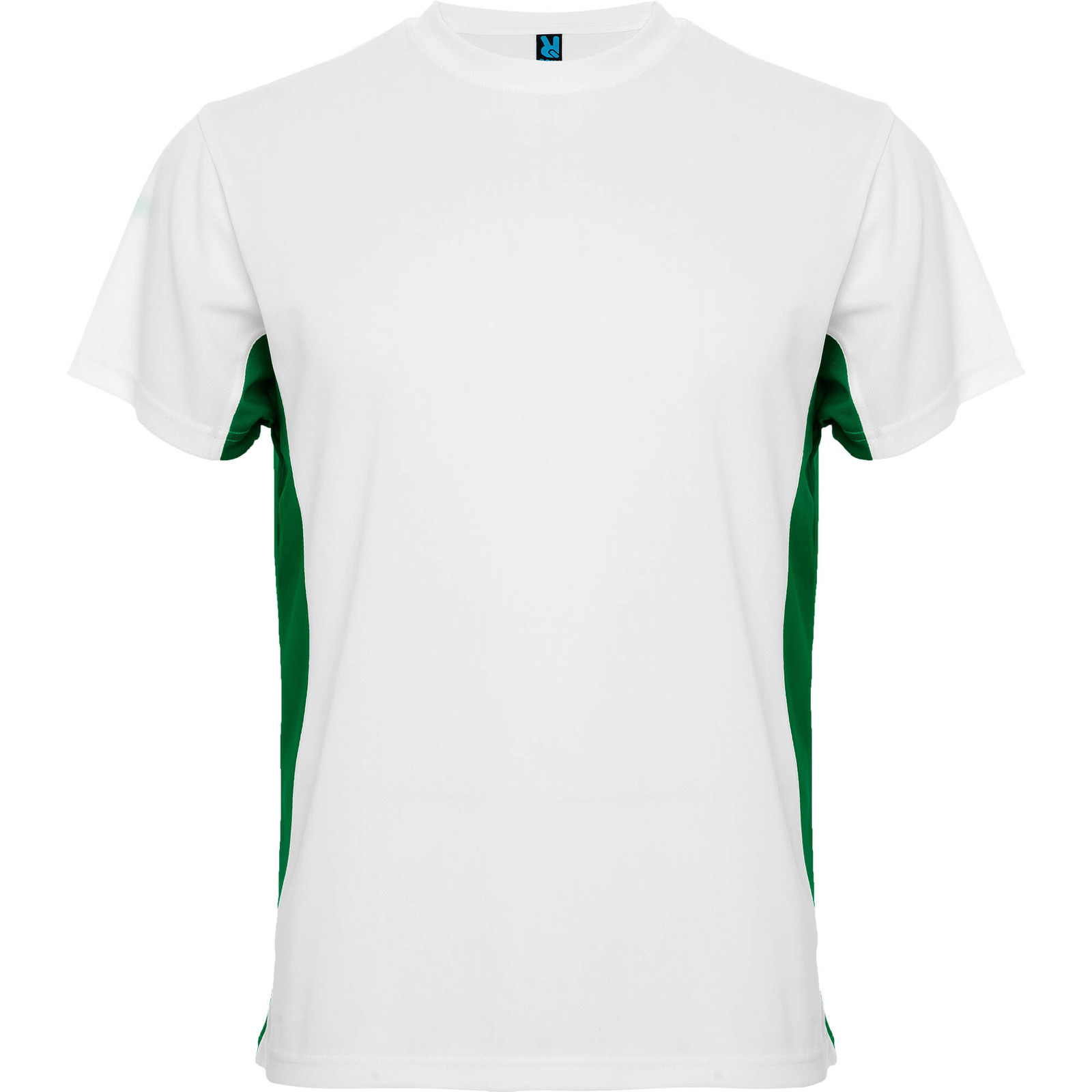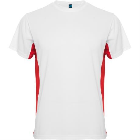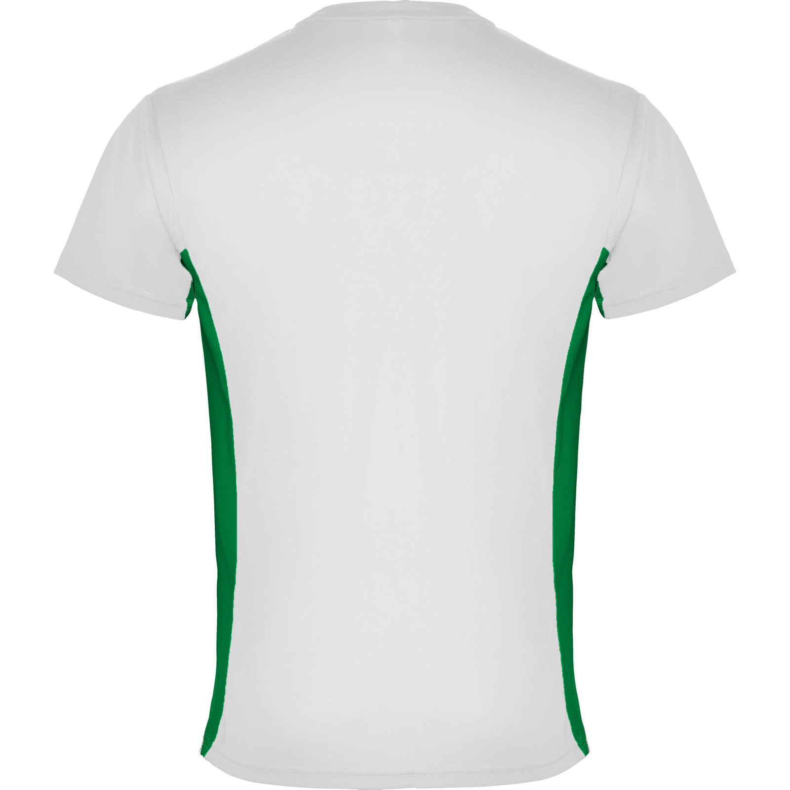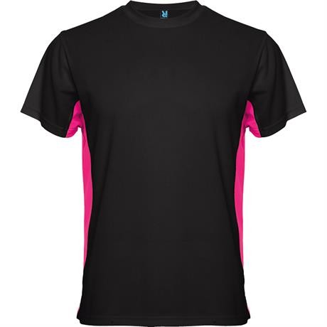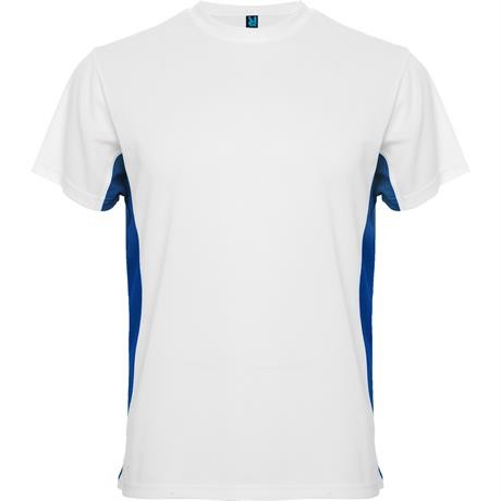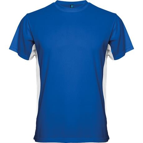 Maglietta girocollo tecnica manica corta, combinazione di due colori. 1.- Scollatura arrotondato con cuciture rinforzate. 2.- Contrasto laterale.
