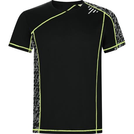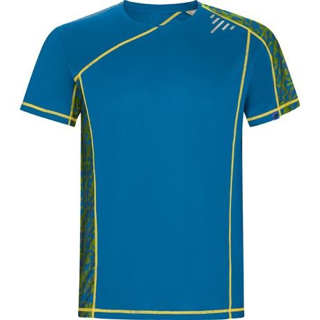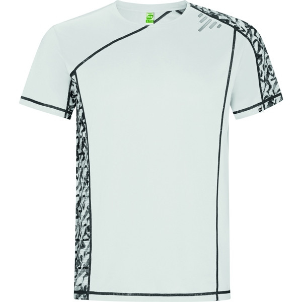 T-shirt tecnica maniche raglan con pannelli stampati. Poliestere riciclato CONTROL DRY. Cuciture decorative fluo. Parte posteriore più lunga della parte anteiore. Etichetta identificativa del logo ECO sulla manica.