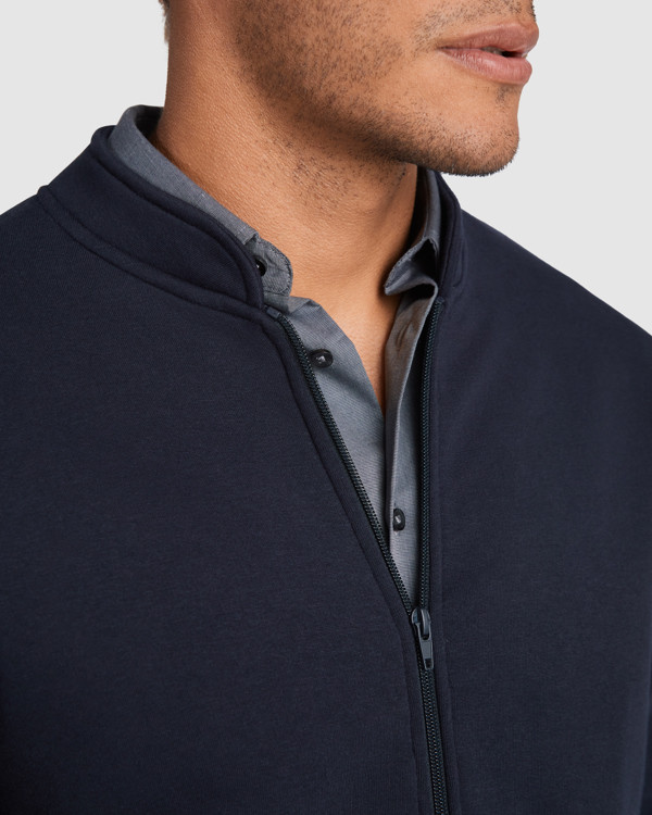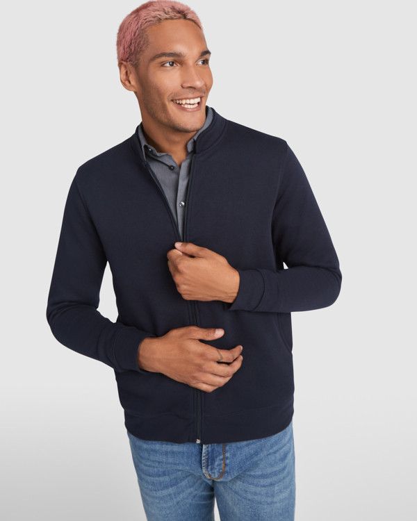Giacca Giubbino in felpa con interno spazzolato a maniche lunghe e colletto alla coreana. Cuciture coperte e rinforzate sul collo. Zipp centrale con tirante. Tasche laterali. Costina 1x1 su polsini e vita.