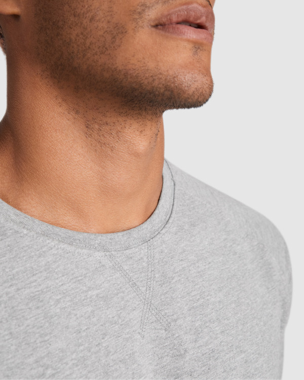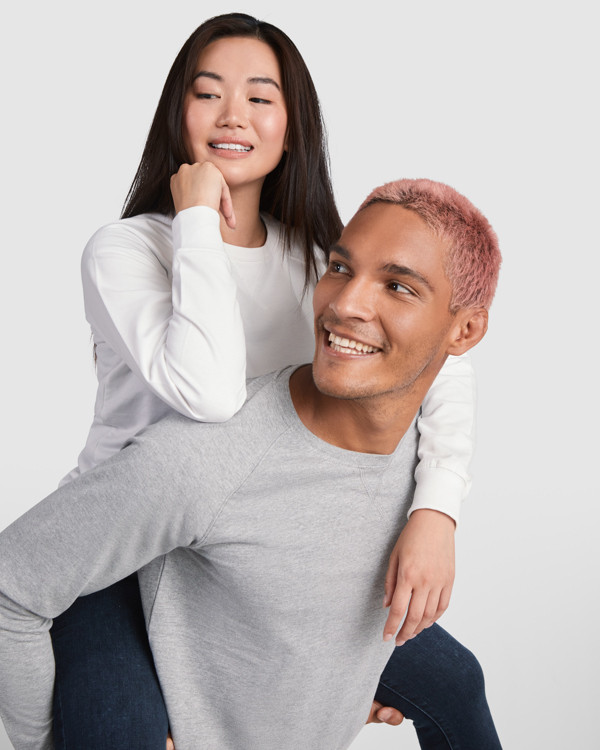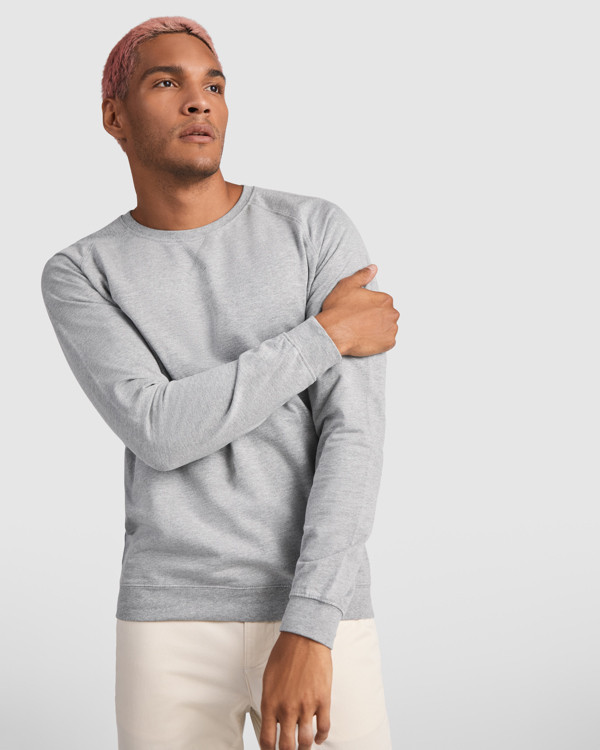 Felpa a maniche lunghe con manica raglan. Collo, polsini e vita in costina 1x1. Girocollo largo con dettaglio di cuciture incrociate, e cuciture coperte rinforzate all´interno del collo.