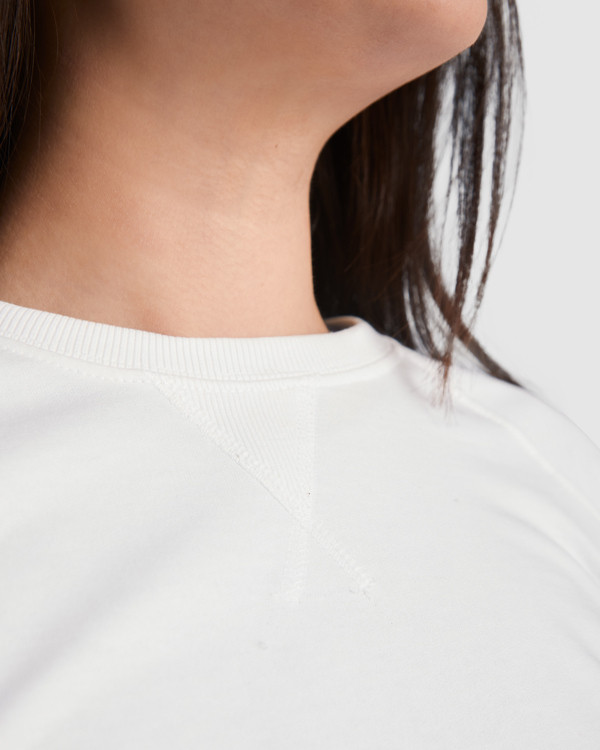 Felpa in cotone manica lunga stile ranglan. Collo, polsini e cintura in costina 2x2. Girocollo con copricuciture di rinforzo all´interno del collo. Cuciture frontali incrociate e rinforzate in costina 2x2.