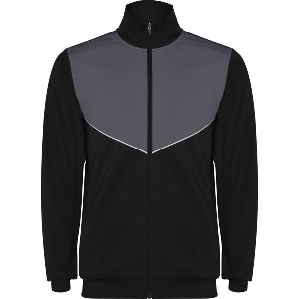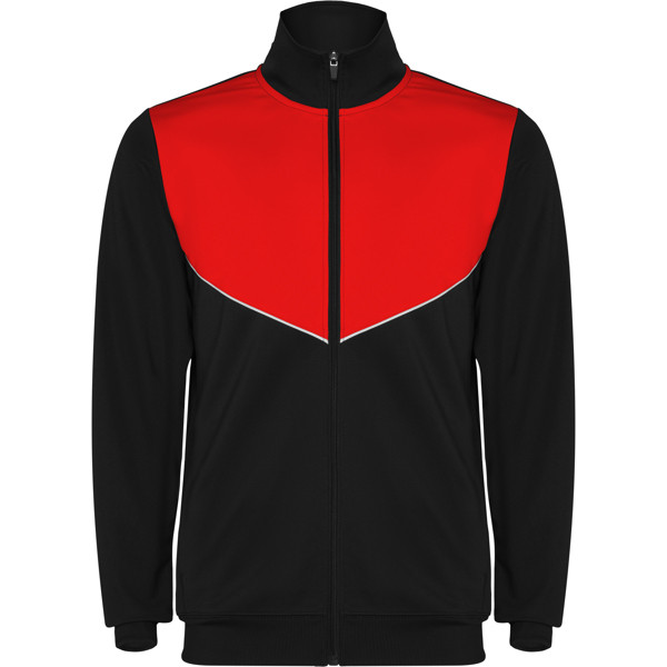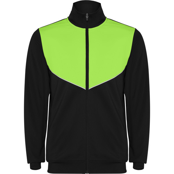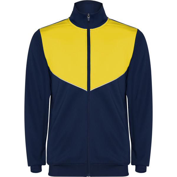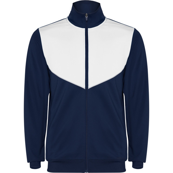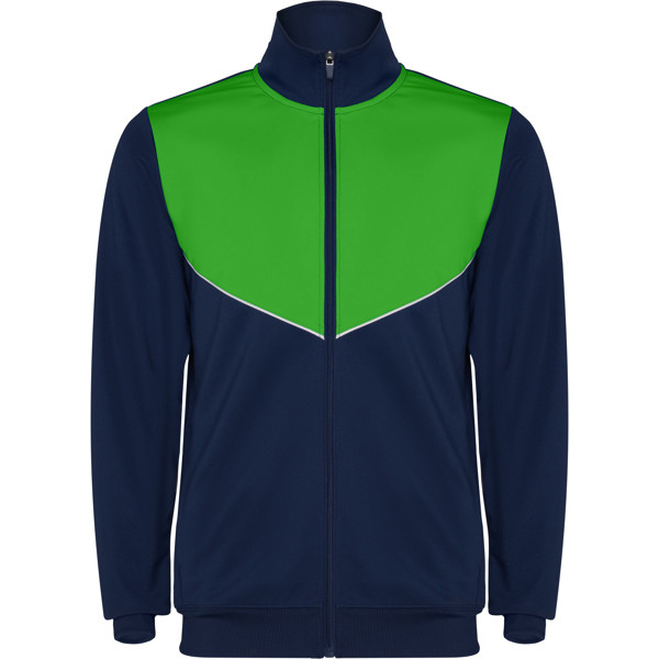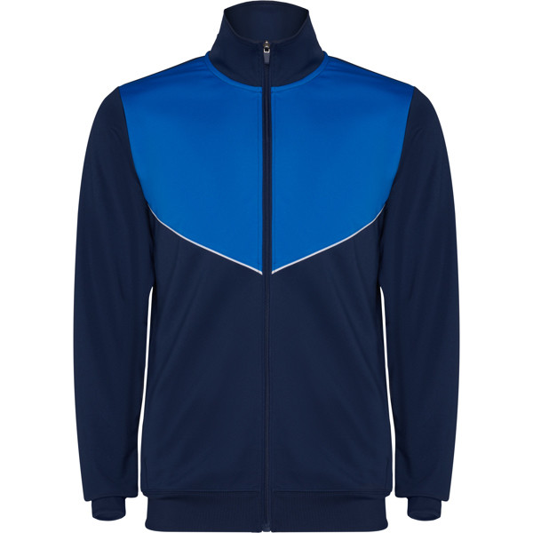 Tuta da ginnastica in leggero tessuto elasticizzato.· Giacca con colore a contrasto e cucitura sul petto.· Collo alto con cuciture a contrasto.· Cerniera centrale· Tasche laterali.· Polsini e vita a costine 2x2.· Pantaloni con vita elastica e cordoncino. · Parte laterale a contrasto con bordi di cucitura. · Orlo con cerniera.