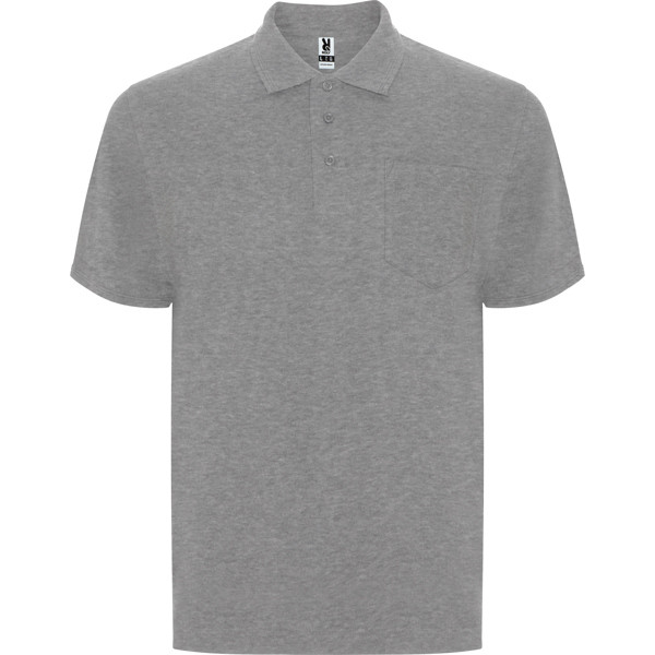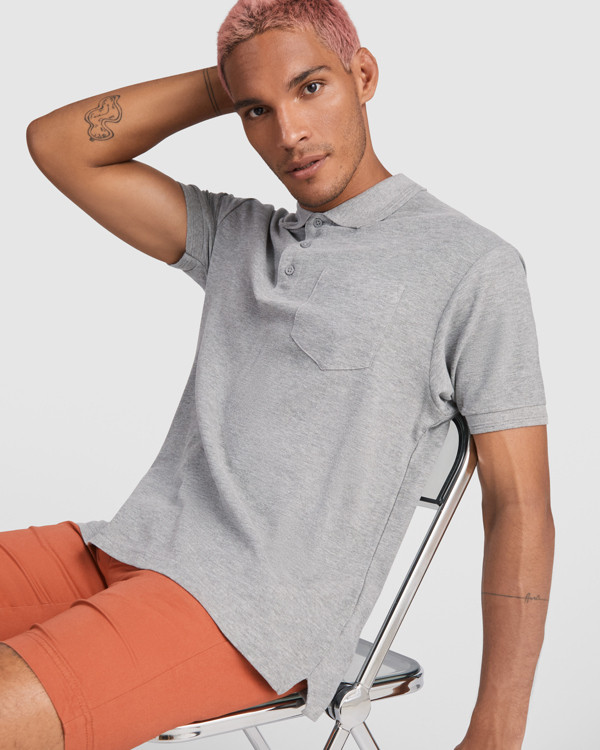 Polo manica corta con taschino lato cuore. Collo a costine 1x1 e bordo delle maniche con dettaglio in rilievo. 3 bottoni. Cuciture rinforzate sul colletto.