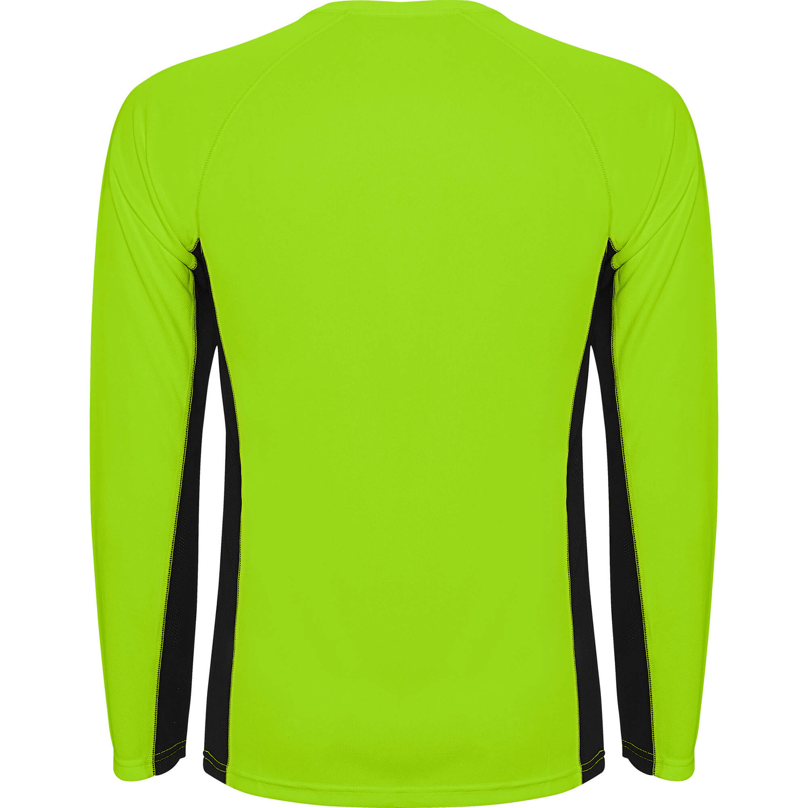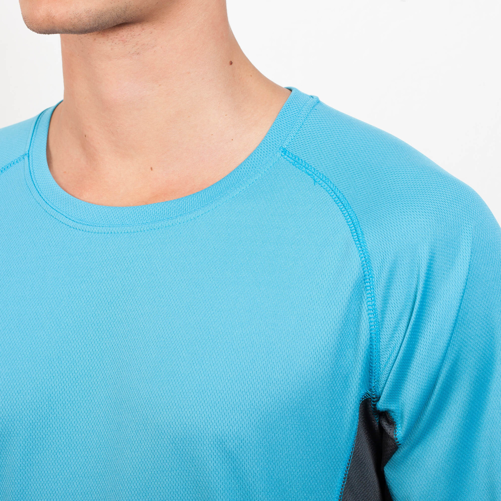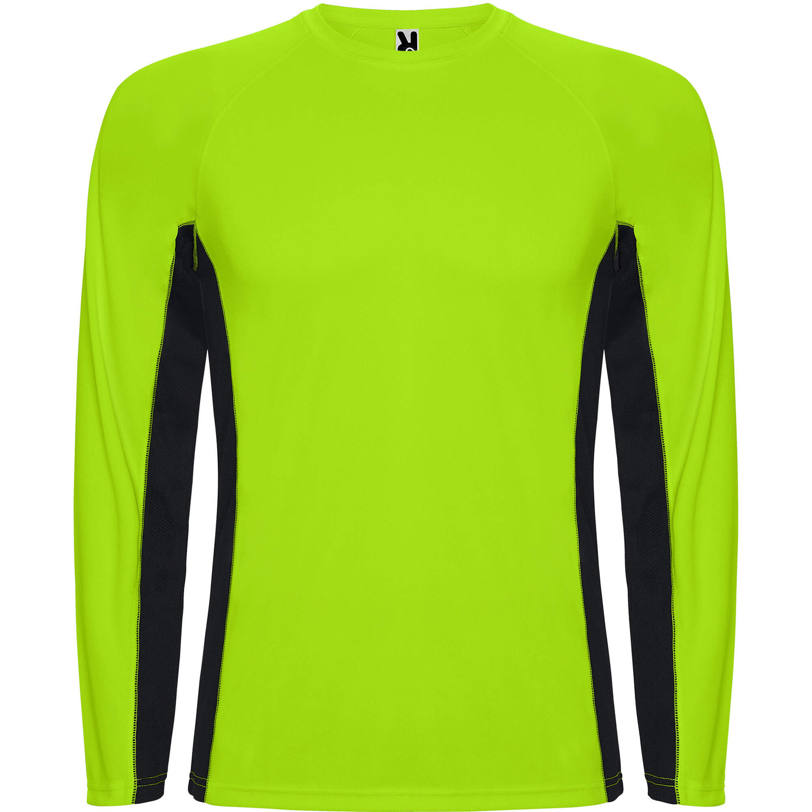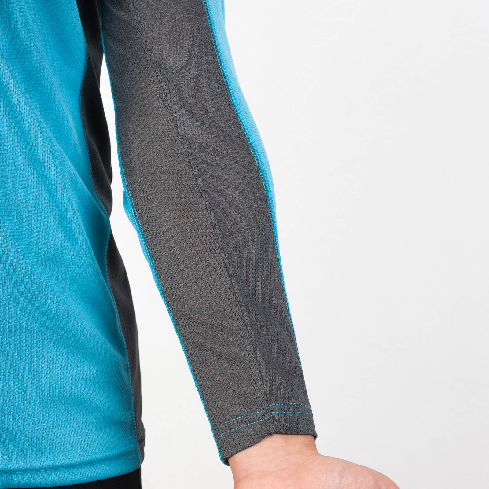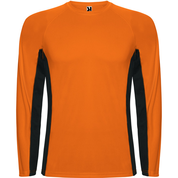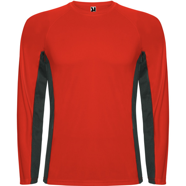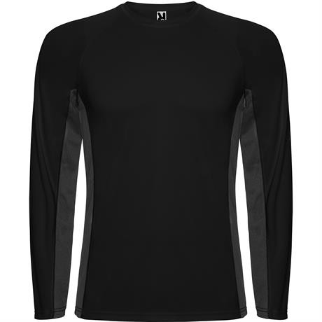 Maglietta tecnica combinata, con due tessuti di poliestere. Maniche lunghe stile raglan. Tessuto principale occhio di pernice, pannelli laterali e interni delle maniche con tessuto microforato. Girocollo con cuciture rinforzate al suo interno. Maglietta con tessuto confortevole e facilmente adattabile al corpo.