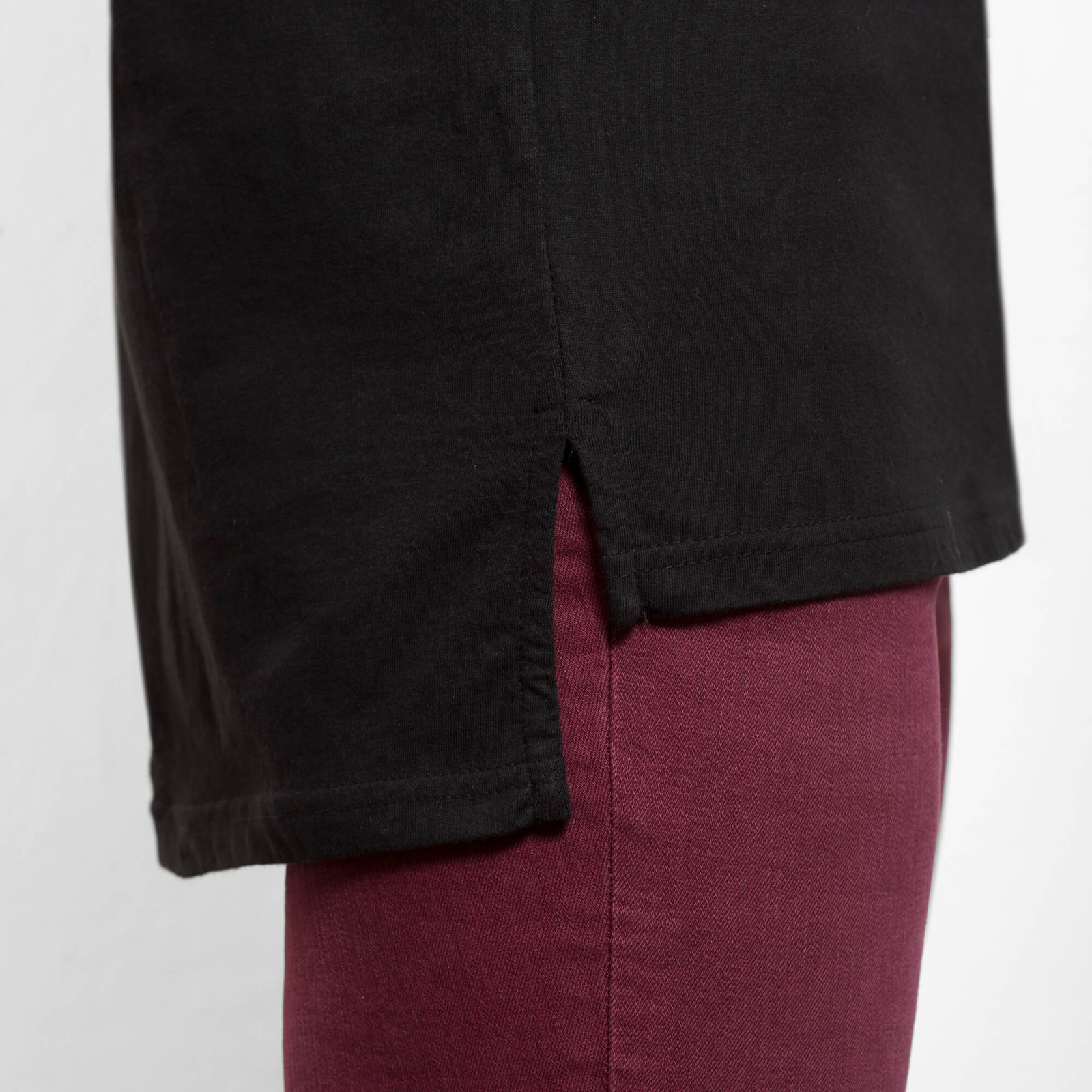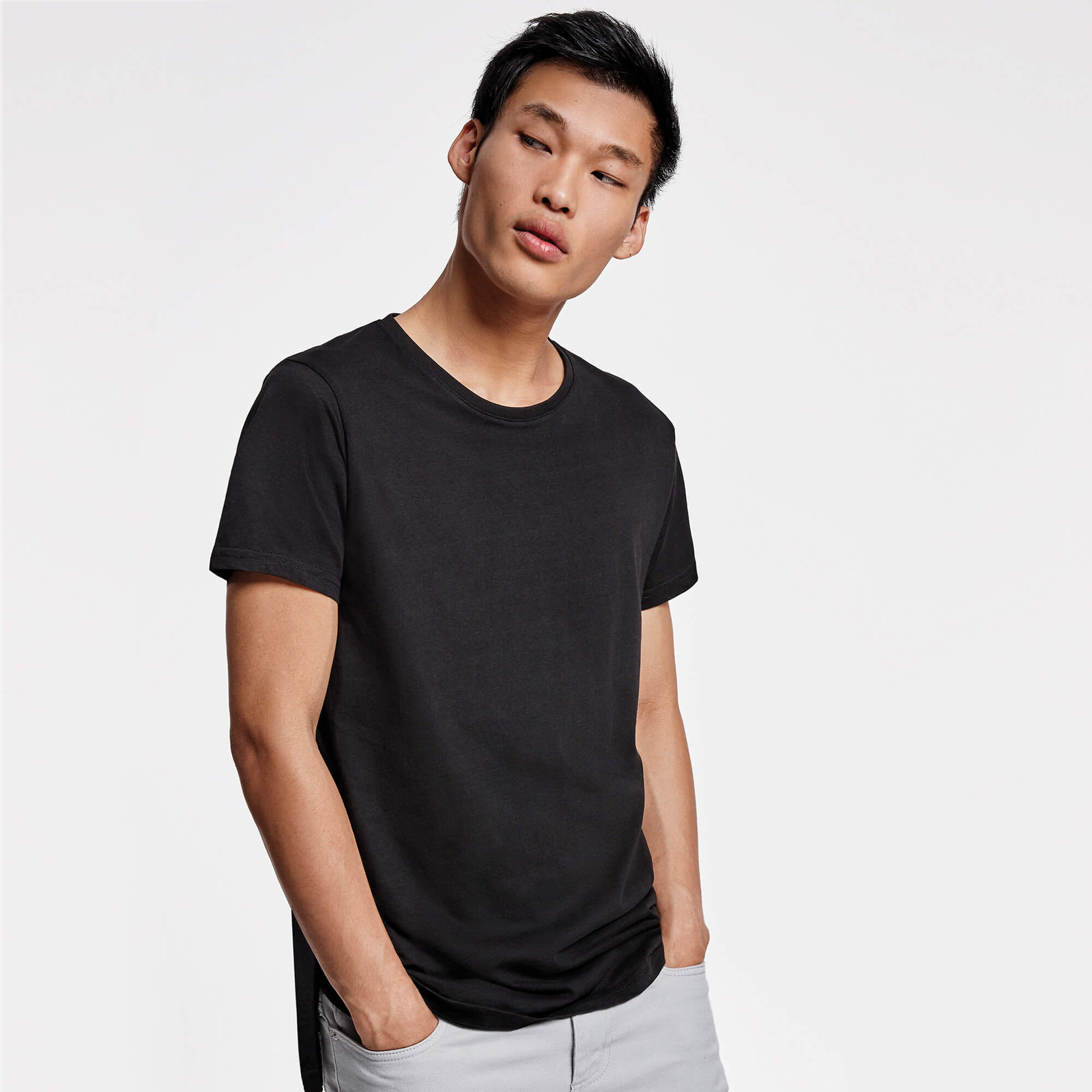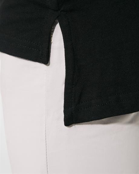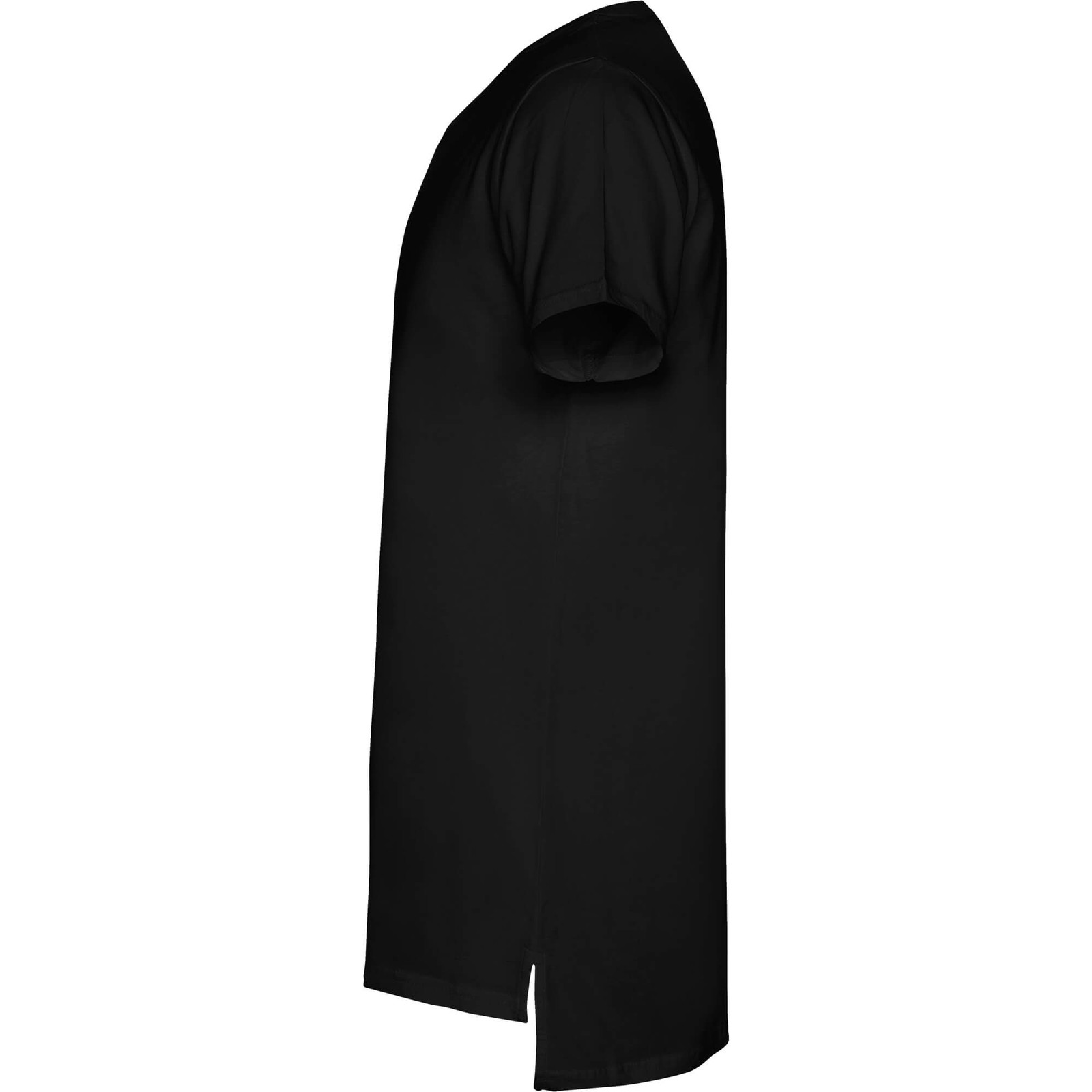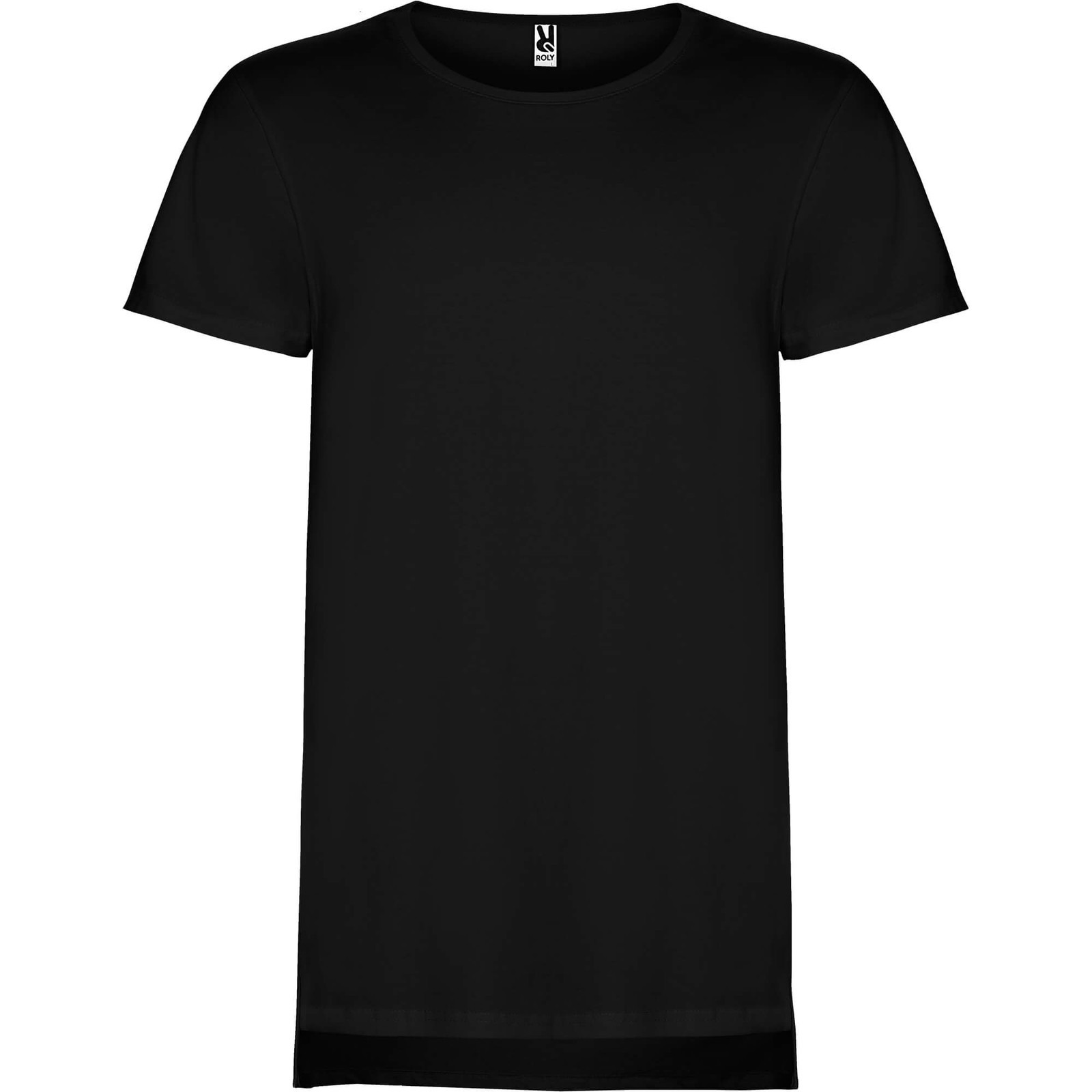 Maglietta manica corta unisex, manica corta, taglio extra lungo, girocollo a due strati con elastane. Spacchetti laterali nel fondo. Il taglio della schiena è leggermente più lungo di quello anterioire.