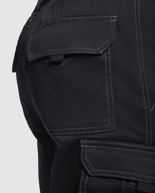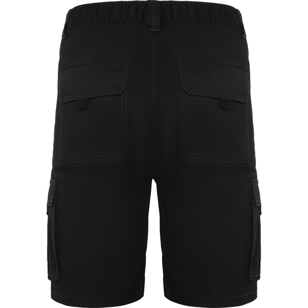 Pantaloncini con tasche. - · Vita elasticizzata regolabile sul retro. - · Due tasche anteriori. - · Due tasche laterali con patta, chiusura con velcro e soffietto centrale. - · Due tasche posteriori con patta e chiusura in velcro.