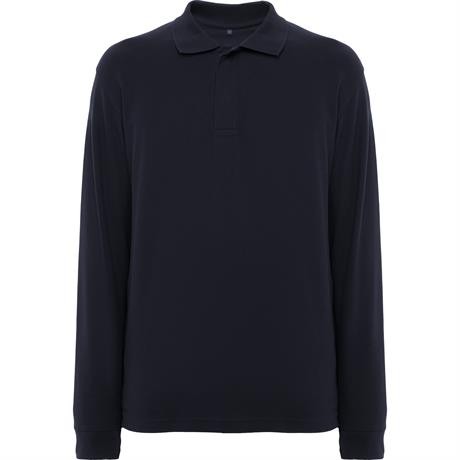 Polo a maniche lunghe. Collo e polsini a costine 1x1. Patta di chiusura in velcro. Copri cuciture rinforzato sul collo. Spacchetti laterali al fondo.