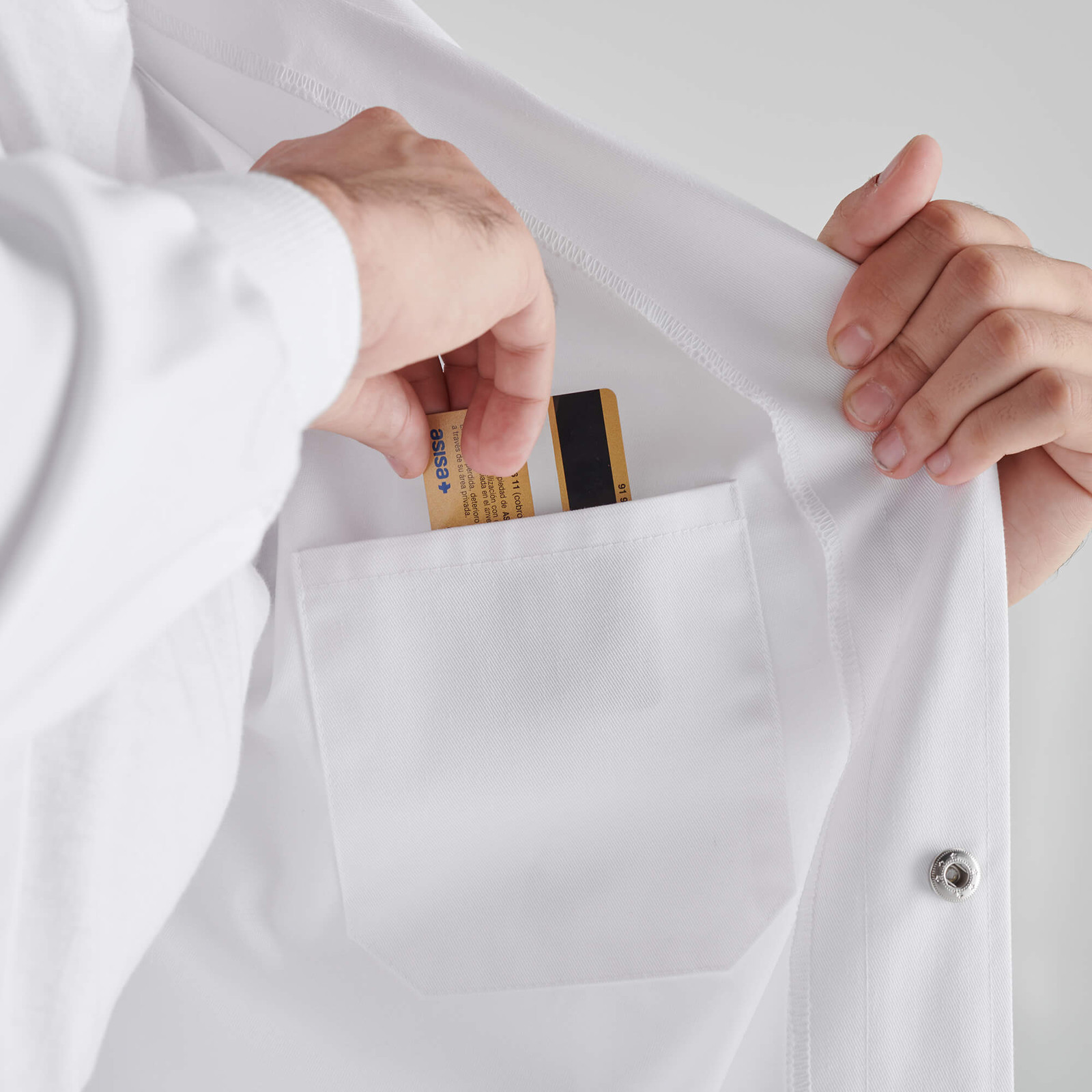 Camice a maniche lunghe unisex. - - Polsini regolabili 1x1 a costine. - - Apertura centrale con pulsanti automatici all'interno. - - Tasca interna sul lato sinistro. -
