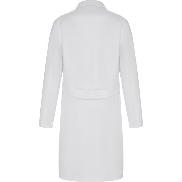 Camice di serivizio manica lunga aderente. - 1. Collo con bavero. - 2. Apertura centrale con 5 bottoni in tinta. - 3. Una tasca sul petto e due laterali. - 4. Cinturino posteriore.