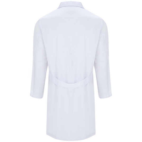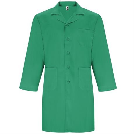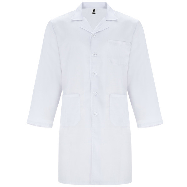 Camice da lavoro unisex manica lunga: 1. Collo con bavero. 2. Apertura centrale con 5 bottoni in tono. 3. Una tasca sul petto e due laterali. 4. Cinturino posteriore.