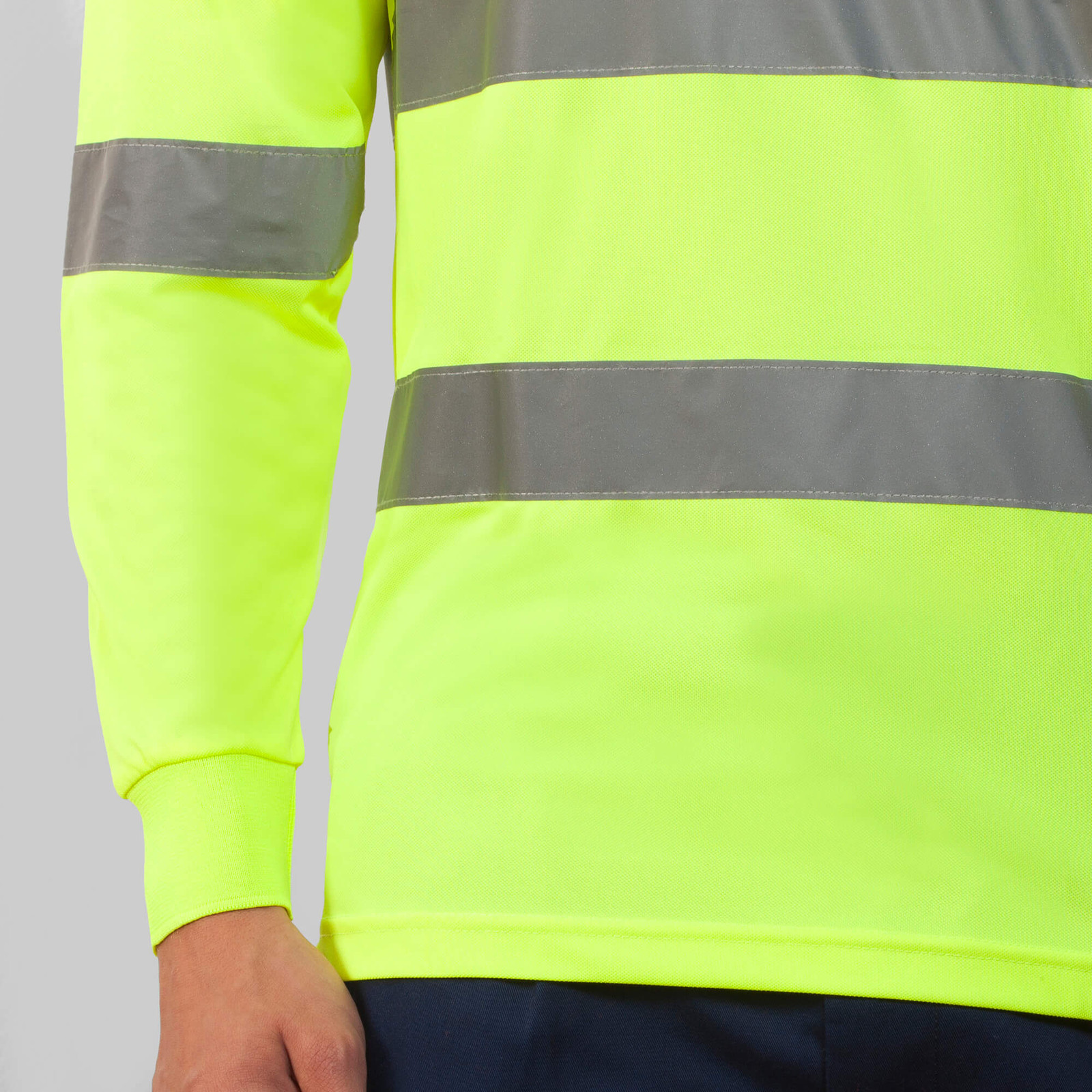 Polo tecnica maniche lunghe alta visibilità con tre bottoni. Polsini in costina 1x1. Due bande laterali orizzontali sul torso e maniche. Tesutto antistrappo.