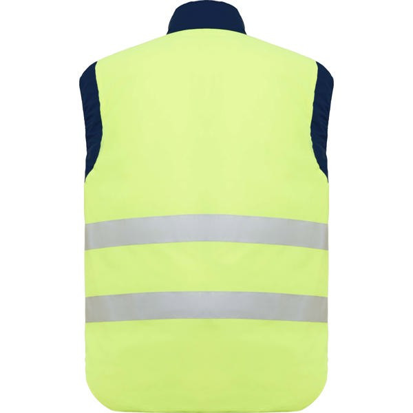 Gilet reversibile multitasche alta visibilità con collo alto. - Gilet multitasche. - · Cerniera centrale con tiretto reversibile. - · Una tasca esterna per cellulare sul lato destro. - · Due tasche frontali con soffietto e spacchi laterali. - · Due spazi per penne. - · Tasca con cerniera. - · Giacca a vento sulle maniche. - · Orlo posteriore con gonna. - · Regolatore elastico. - Gilet alta visibilità - · Colore fluorescente. - · Due nastri riflettenti orizzontali.