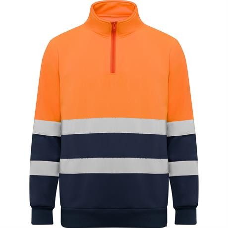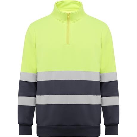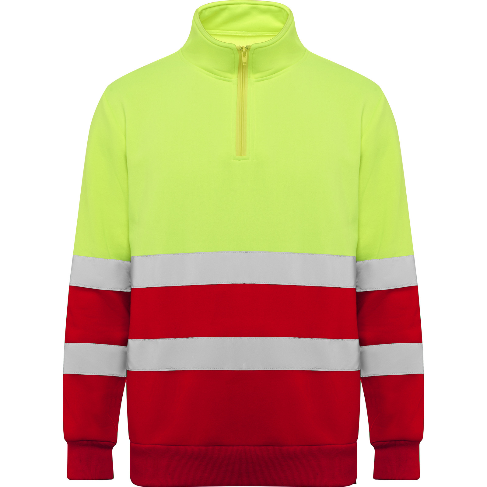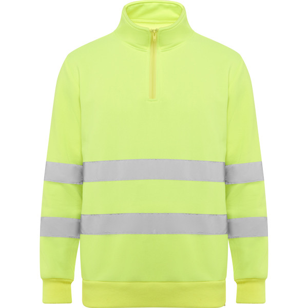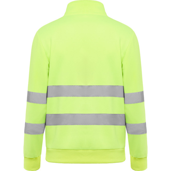 Felpa ad alta visibilità con misura della zip e collo alto con protezione per il mento e linguetta. Copertura delle cuciture rinforzata all'interno del colletto. Strisce riflettanti orizzontali su torso e maniche. costina 1x1 su polsini e orlo.