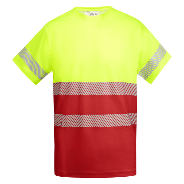 T-shirt tecnica ad alta visibilità con maniche corte. Collo rotondo in tessuto principale. Due strisce riflettenti segmentate sul torso e una sulle maniche. Tessuto in misto poliestere e cotone per garantire comfort e traspirabilità.