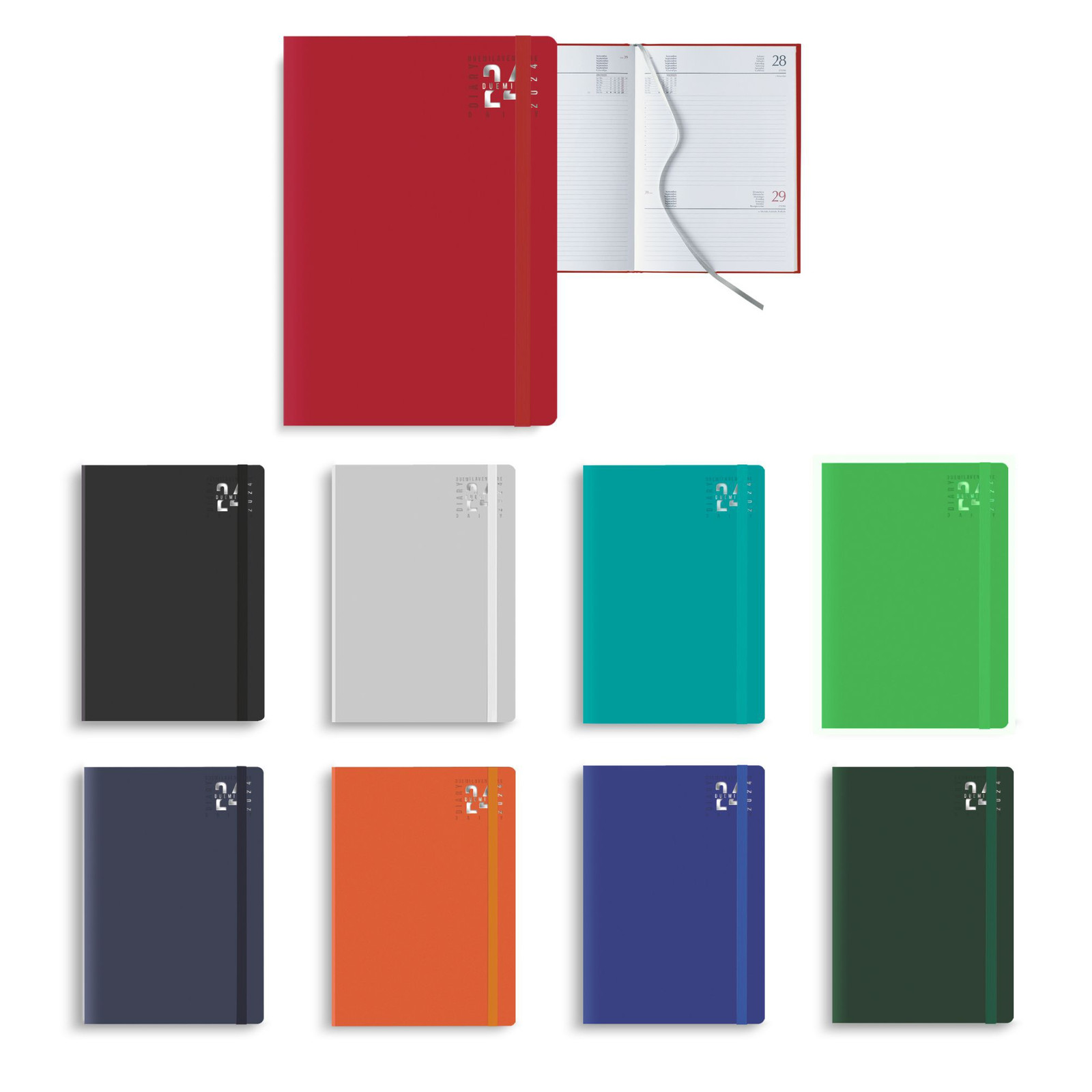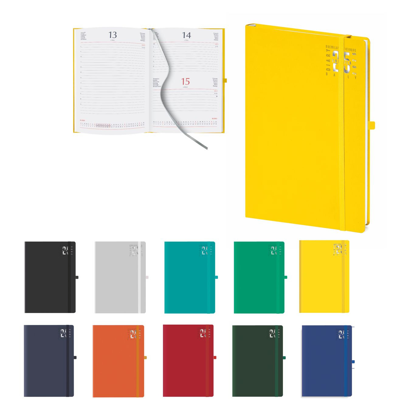Agenda “Dynamic” giornaliera con elastico. 320 pag. Materiale: matra. Interno stampa 2 colori. Carta bianca. Sabato e domenica abbinati. Multilingue. Cartina geografica, rubrica telefonica. Colori: blu, rosso, nero, arancio. royal. verde. Dimensioni cm. 15x21 Imballo: 20xcolore