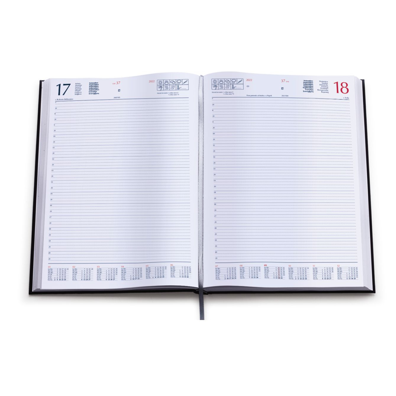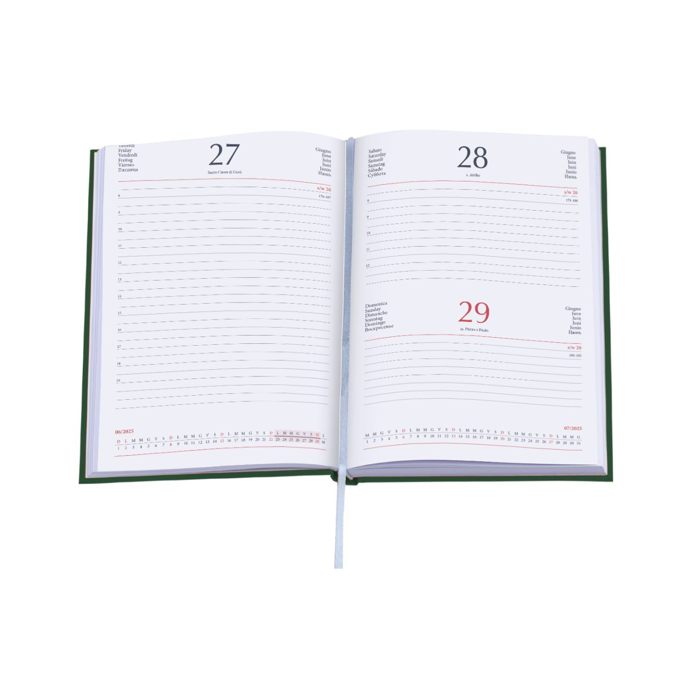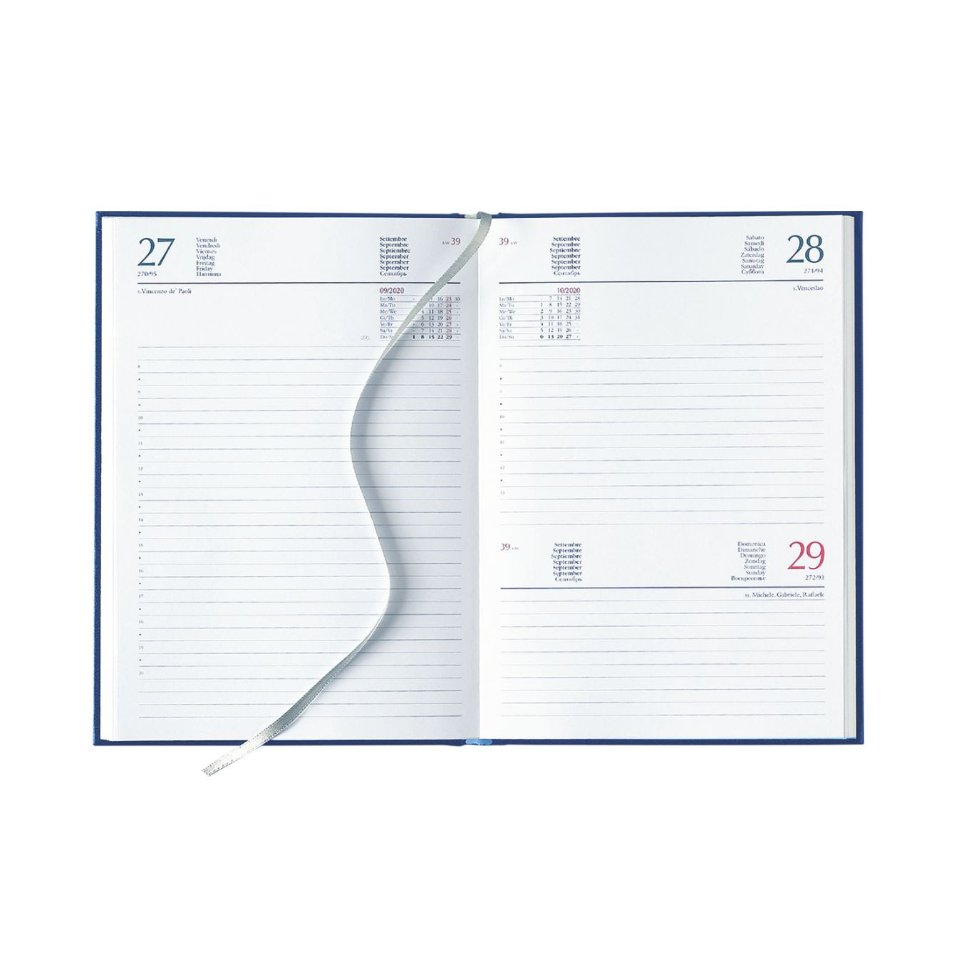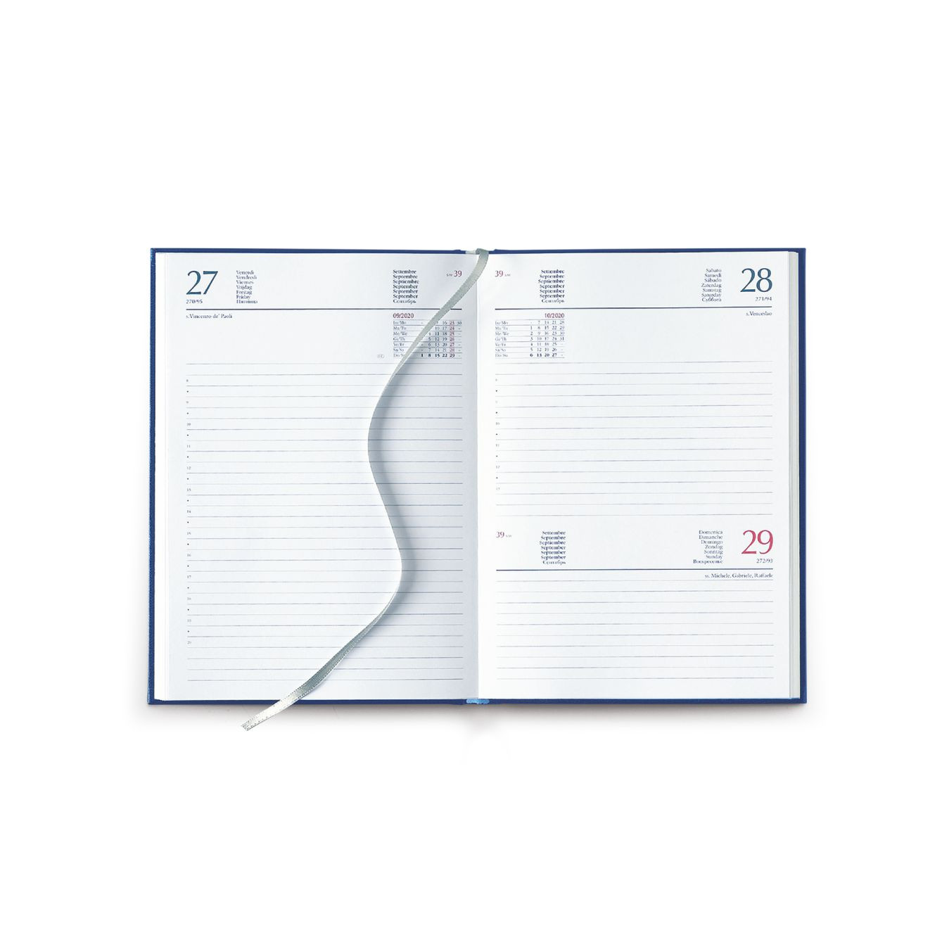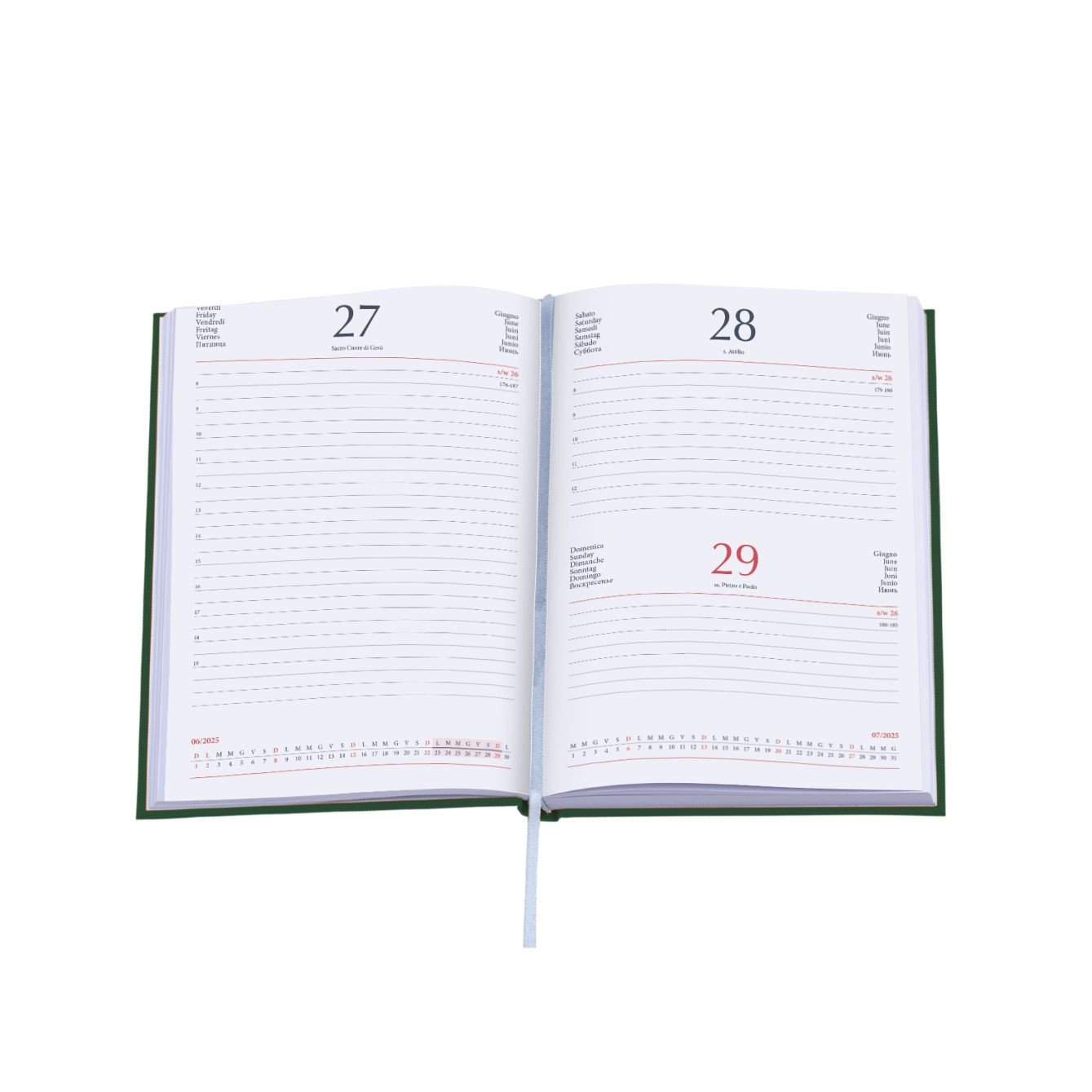 Agenda giornaliera in matra. 320 pag. Interno stampa 2 colori. Multilingue. Sabato e domenica abbinati, rubrica telefonica, cartina geografica, festività nel mondo. Colore unico. . Dimensioni cm 15x21