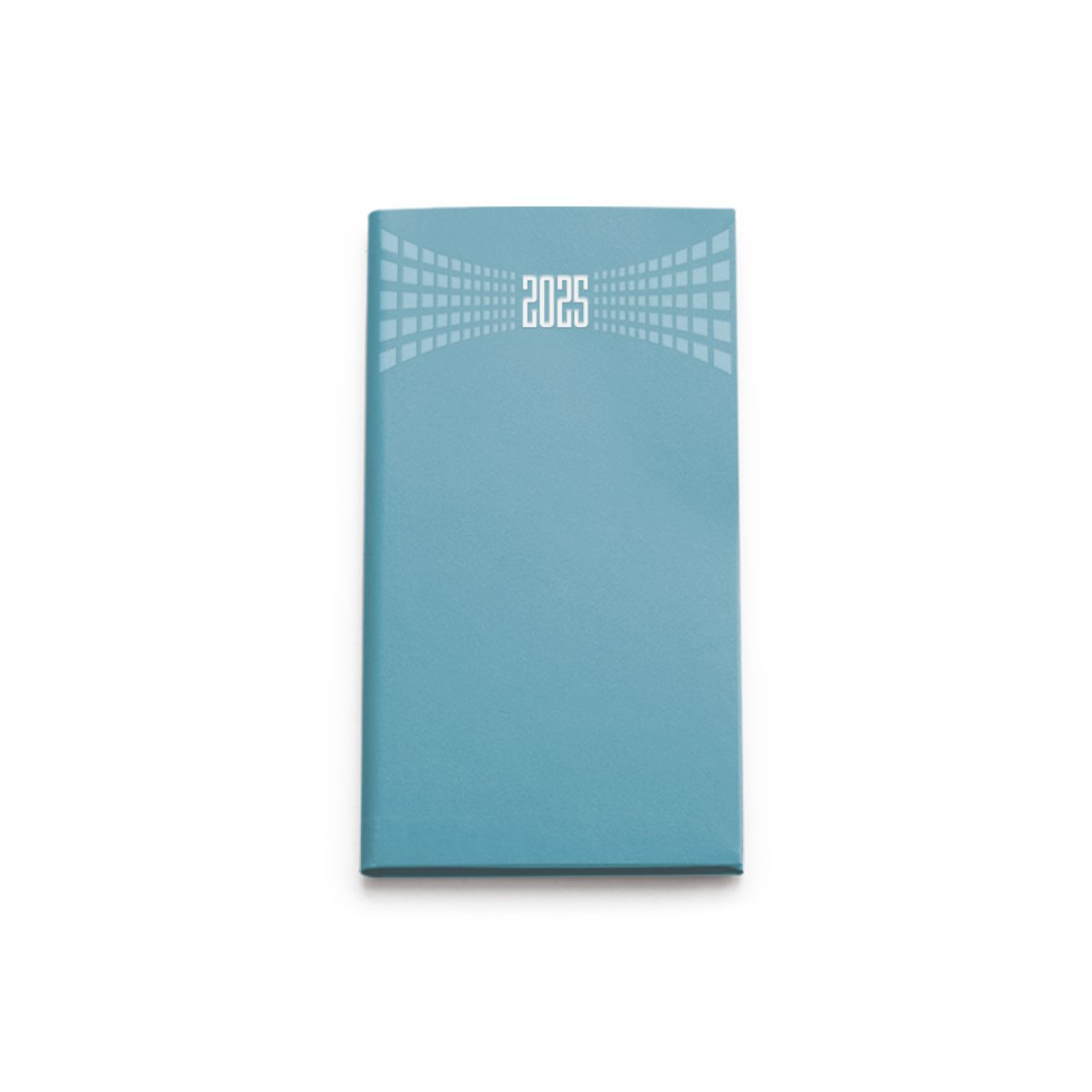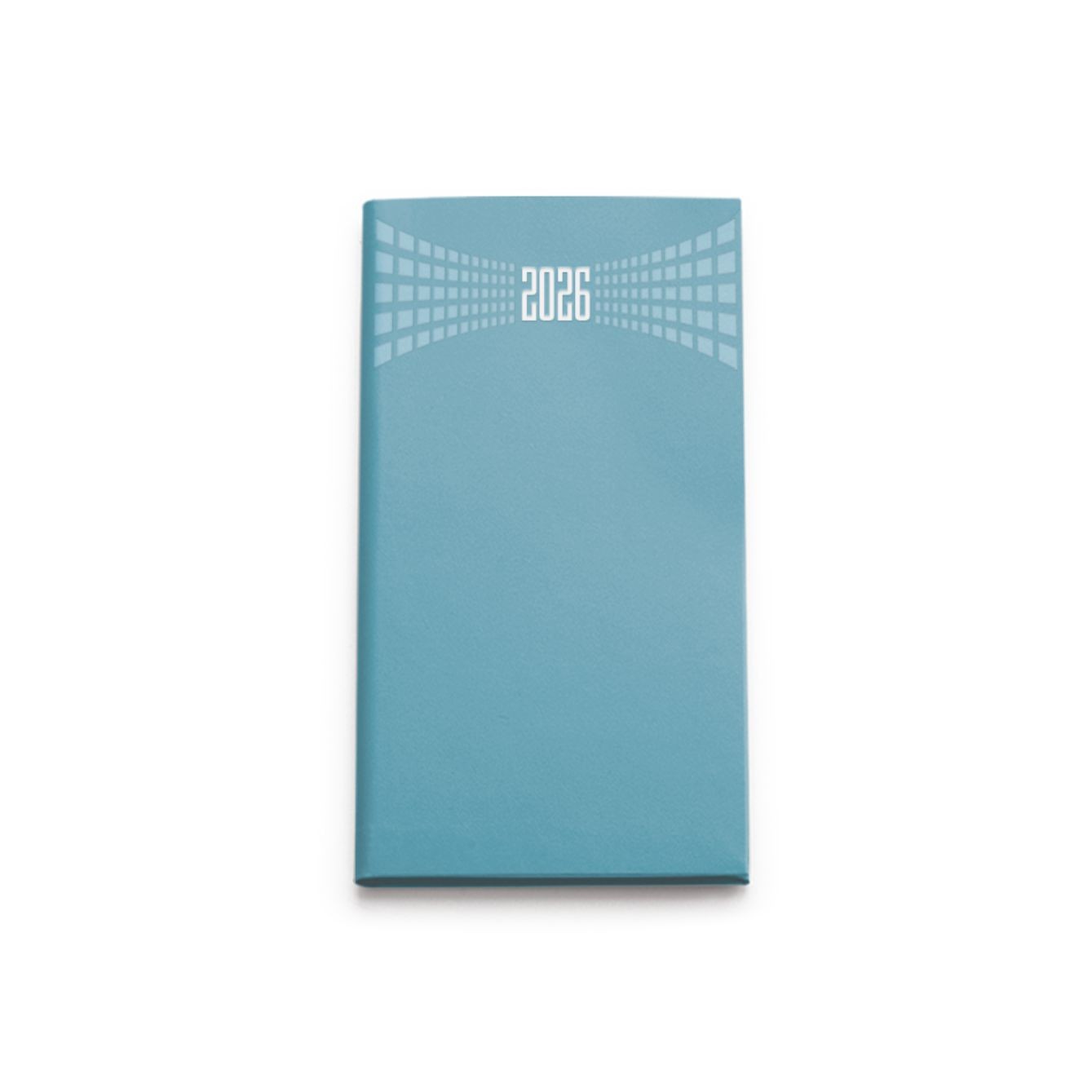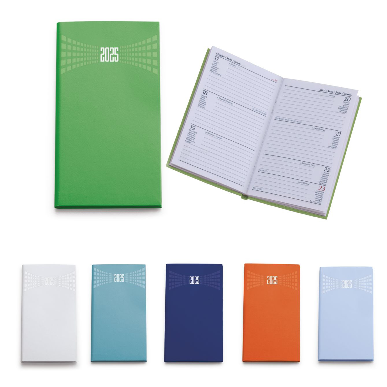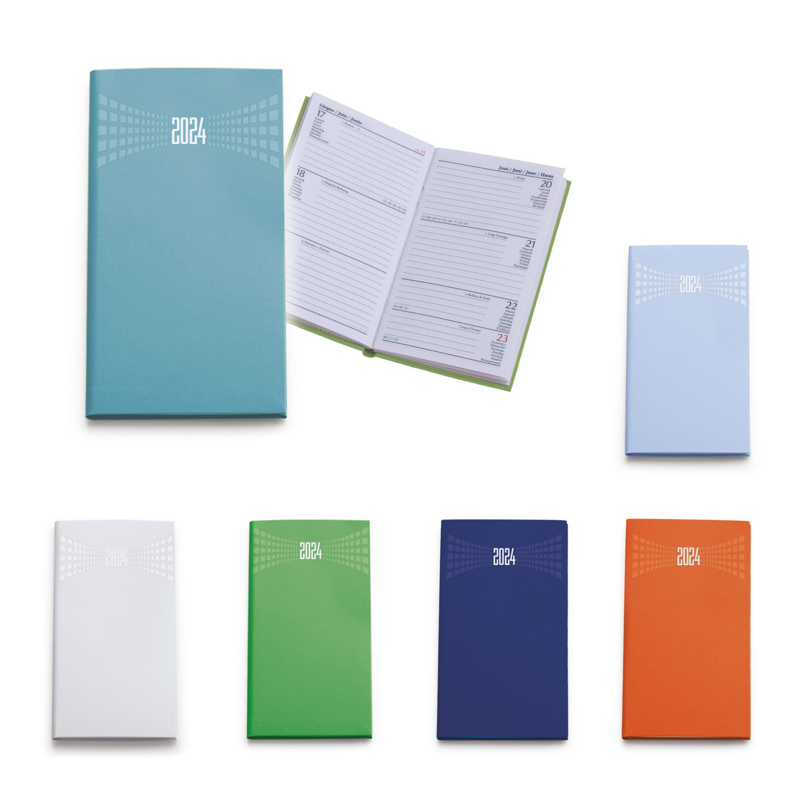Agendina settimanale in matra. Interno stampa 2 colori. Multilingue, rubrica telefonica. Colori pastello: arancio, bianco, cielo, verde, verde acqua, royal. . Dimensioni cm 8x14. Pagine 128.