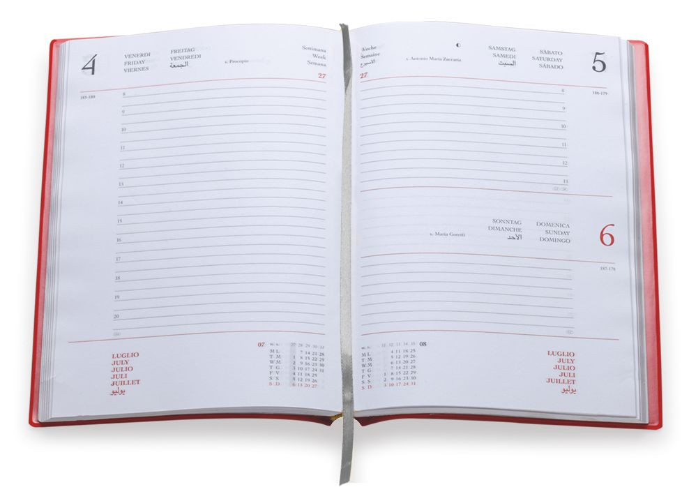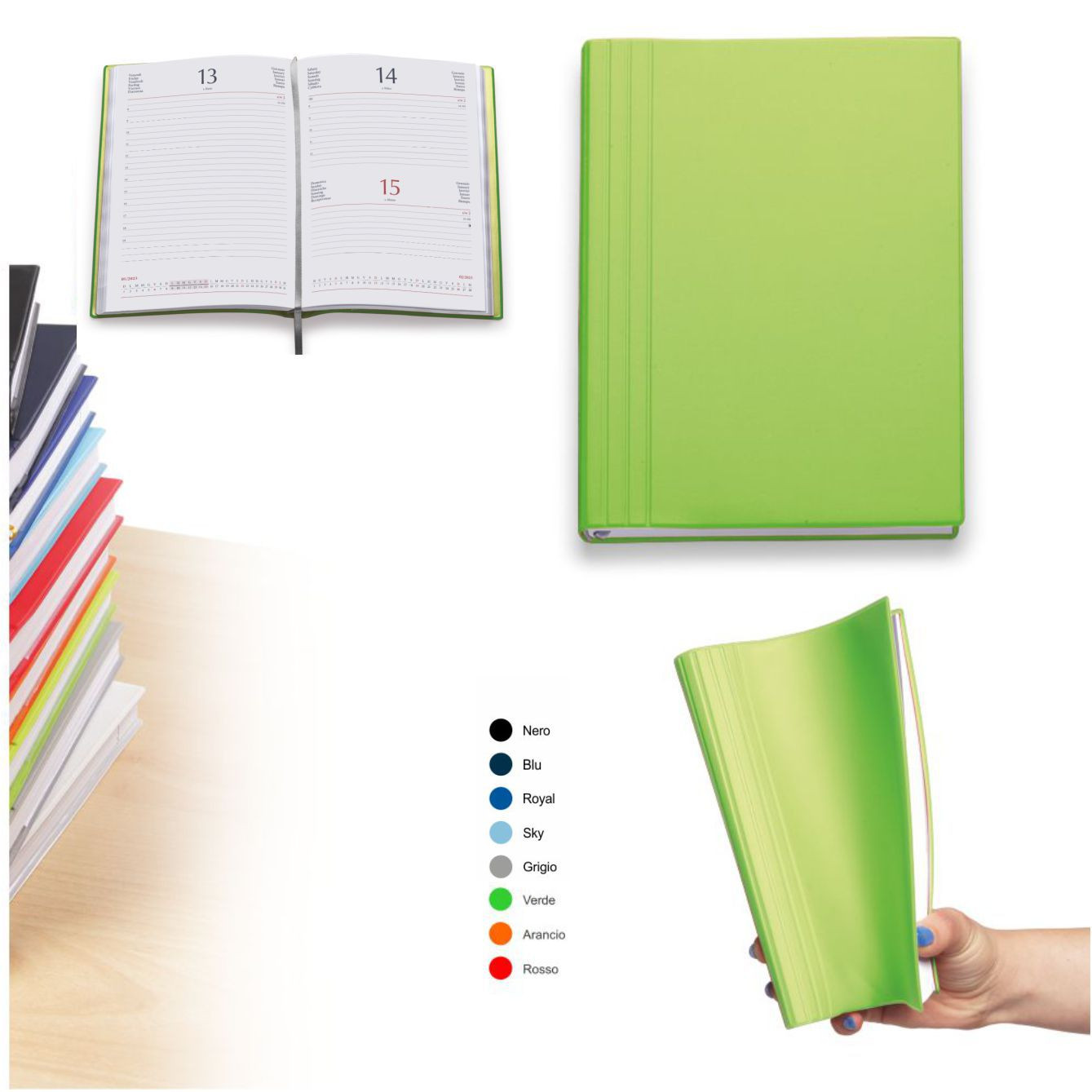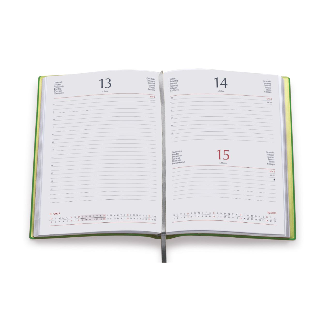 Agenda in tam. 320 pag. Interno mobile giornaliero (15x21). Stampa 2 colori. Multilingue. Sabato e do-menica abbinati, rubrica telefonica, carta bianca. Colori: arancio, nero, rosso, blu, sky, verde, royal, grigio, bianco. Fornita senza astuccio. Dimensioni 15x21