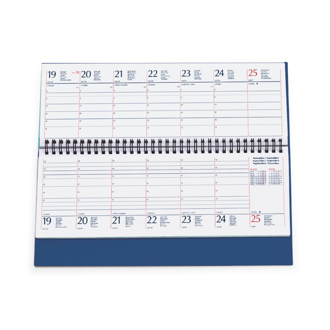 Planning da tavolo. 50 fogli Carta uso mano 80 gr. Stampa 4 colori. Testata cartoncino bianco. Dimensioni cm 43,5x31,5 Imballo: 25 . Carta Naturale. Gr. 80 mq