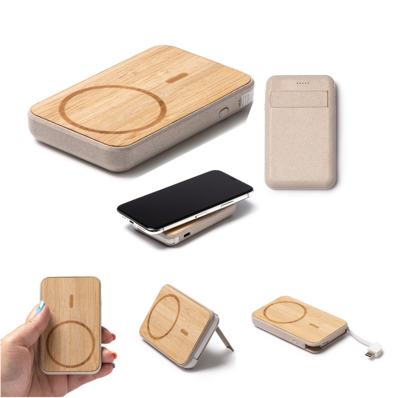 Batteria esterna da 5000 mAh con corpo in bamboo e fibra di frumento e caricabatterie wireless magnetico con supporto per smartphone. Cavo di tipo C incluso. Confezione in scatola di design ecologico. Dimensioni: cm 10,4x6,5x1,6