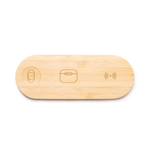 La base di ricarica 3-in-1, realizzato in bamboo, offre 15W di potenza per ricaricare contemporaneamente smartphone, smartwatch e cuffie wireless. Grazie all'ingresso Type-C e al cavo in dotazione, rappresenta una soluzione efficiente ed elegante per mantenere in carica tutti i dispositivi. Dimensioni: cm 16,8x6,4x0,8. Ideale per un utilizzo quotidiano, con un occhio attento al design.