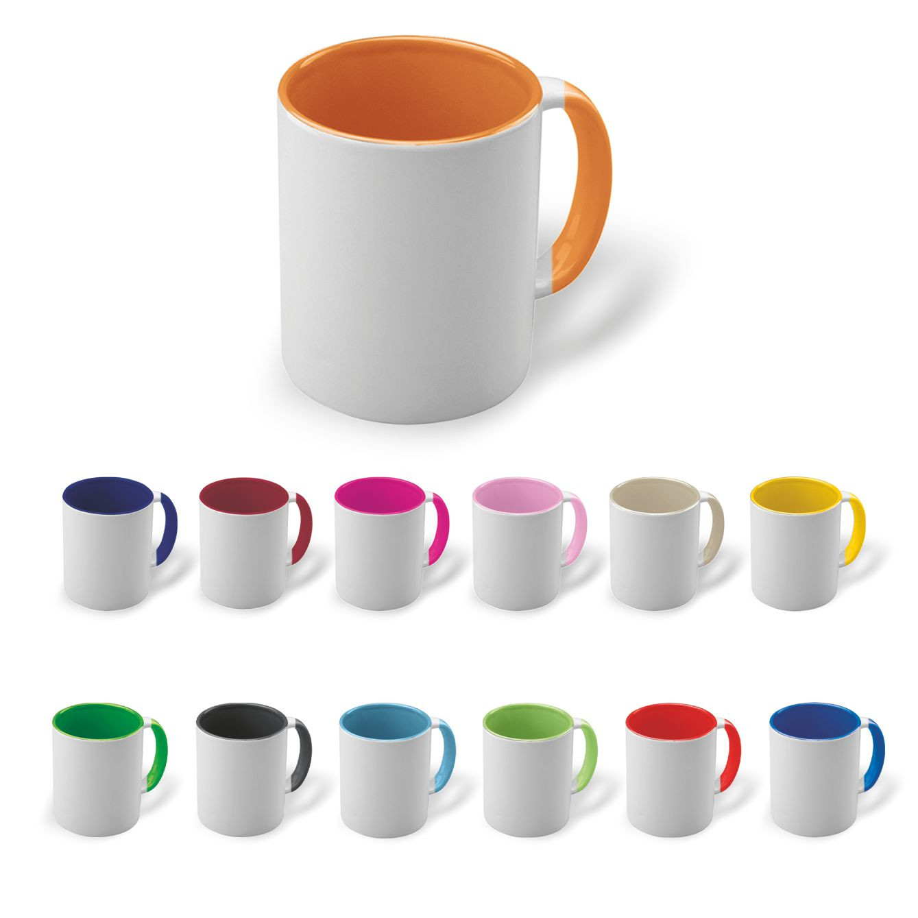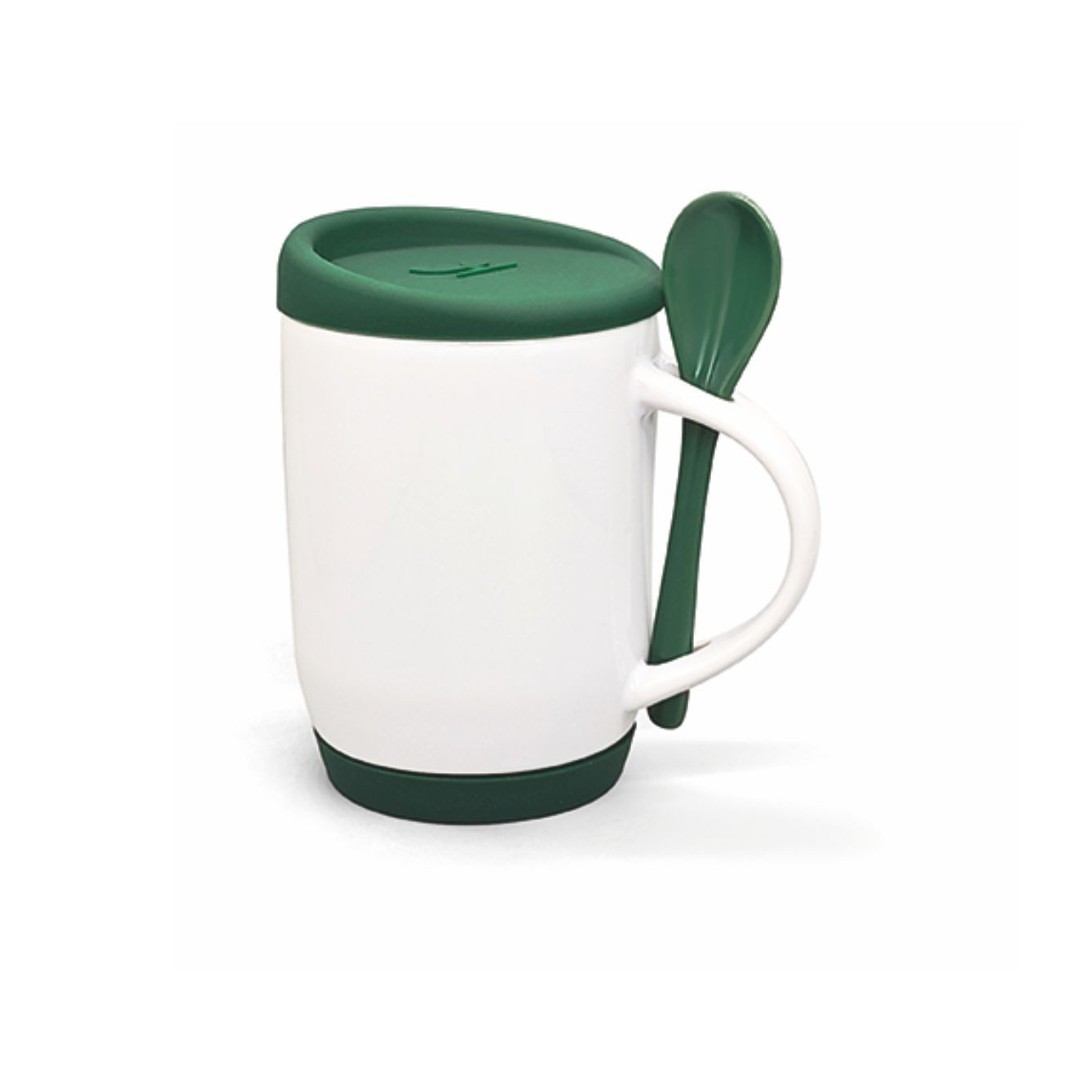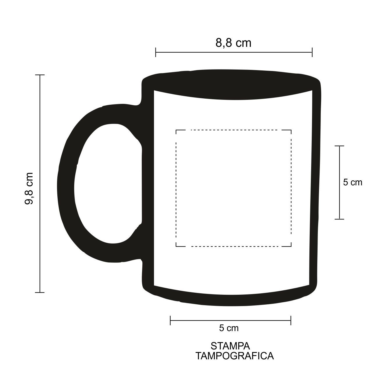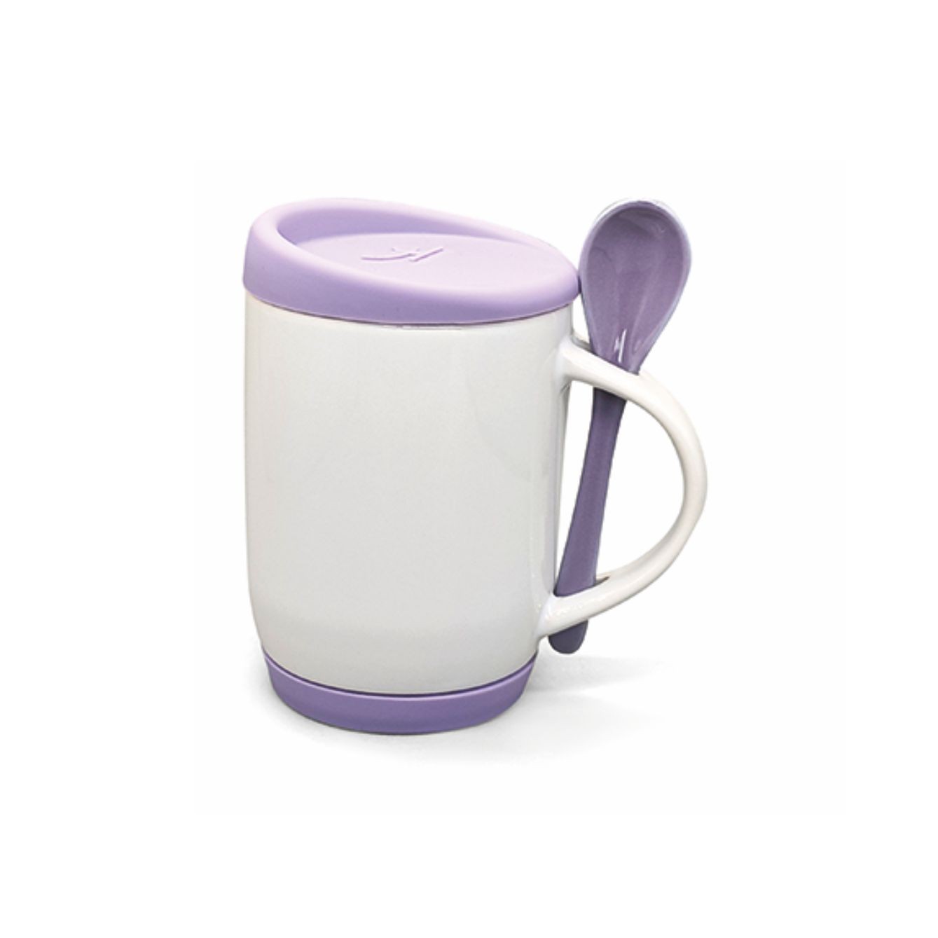 Tazza in ceramica con cucchiaio in ceramica, tappo e base in silicone colorato. In astuccio. Area di stampa: cm 7,5x18. Dimensioni: cm 12,5x7,5Ø,13oz. Perfetta per accompagnarti nelle sfide di ogni giorno.