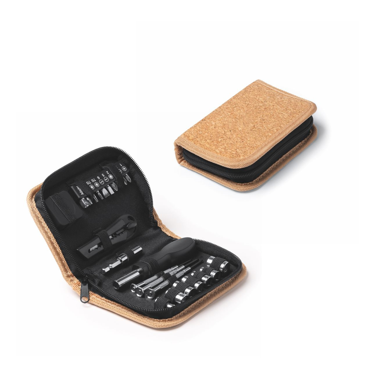 Set di attrezzi da 25 accessori in astuccio di sughero con cerniera. Taglierino, chiave esagonale, cacciavite a stella e piatto, strumento di fissaggio e nastro di misurazione da 100 cm. Confezione in scatola dal design ecologico. Dimensioni: cm 15x4x10