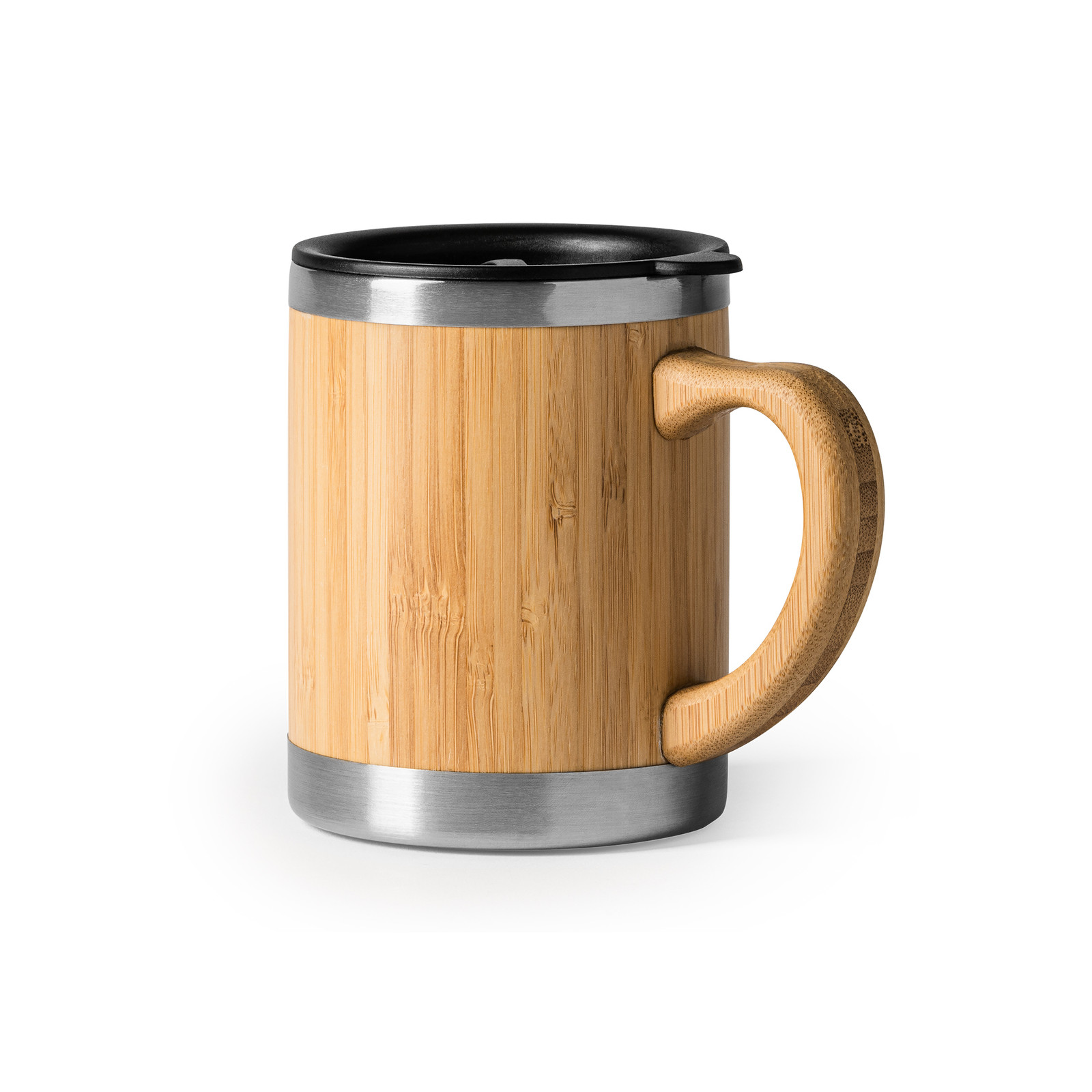 Tazza in acciaio inossidabile a doppia parete con esterno in bambù naturale. Include tappo dosatore. Capacità 340ml. Dimensioni: cm 10,8x8,2. Confezione in scatola eco design. Imballo: 50pz.