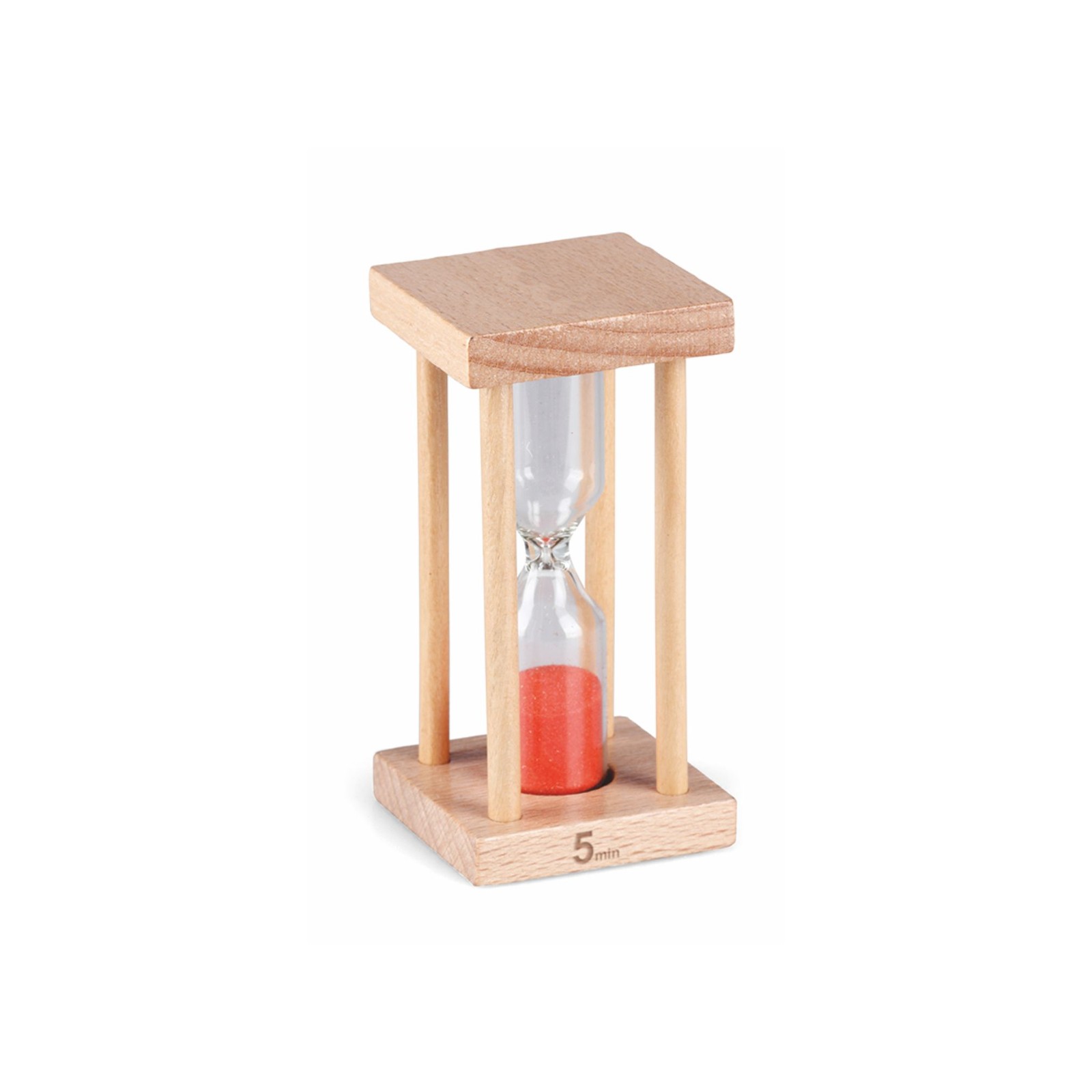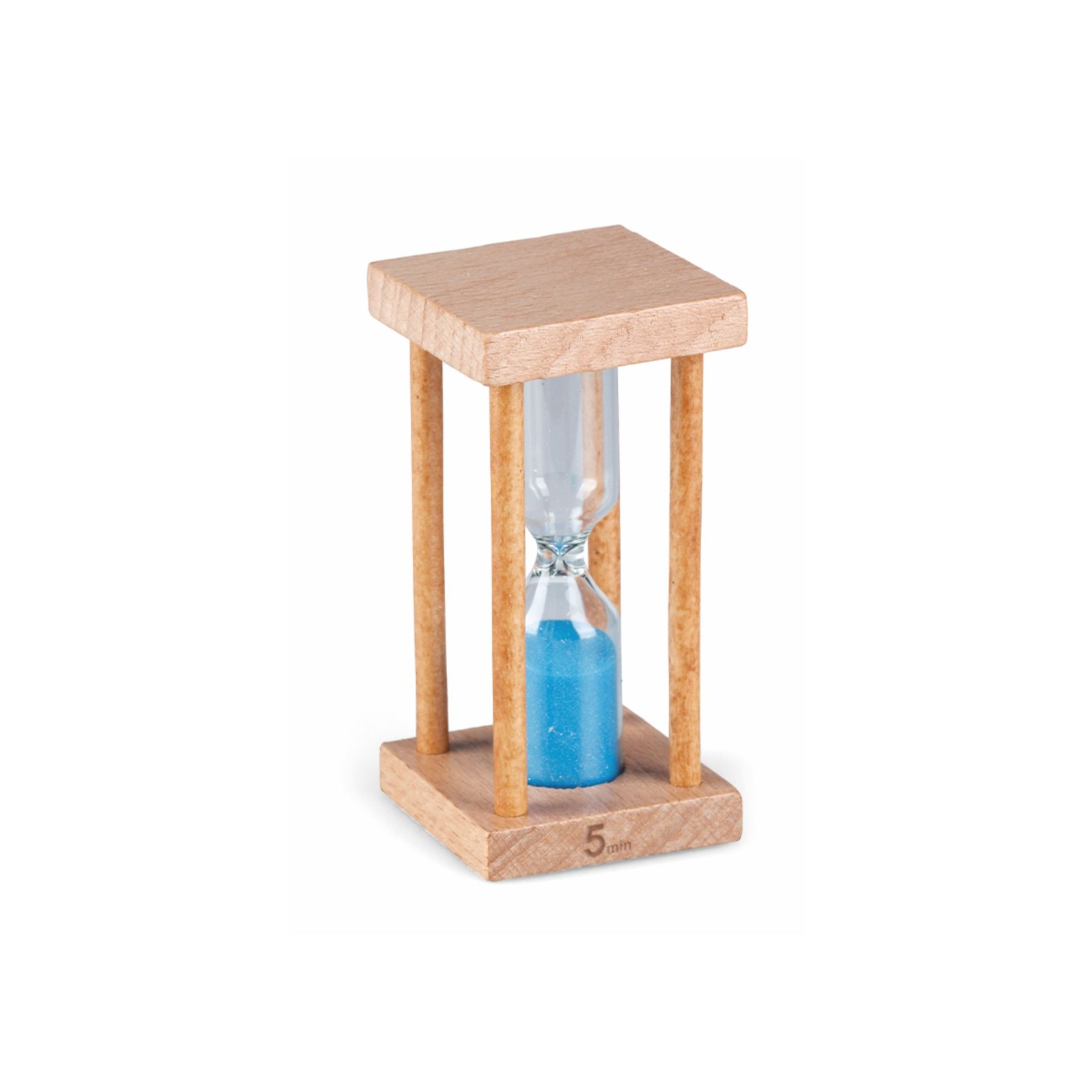 Clessidra in bamboo 5min. Area stampabile: cm 3,5x3,5. Dimensioni: cm 4,2x9,2. Confezione in astuccio. Imballo: 200pz