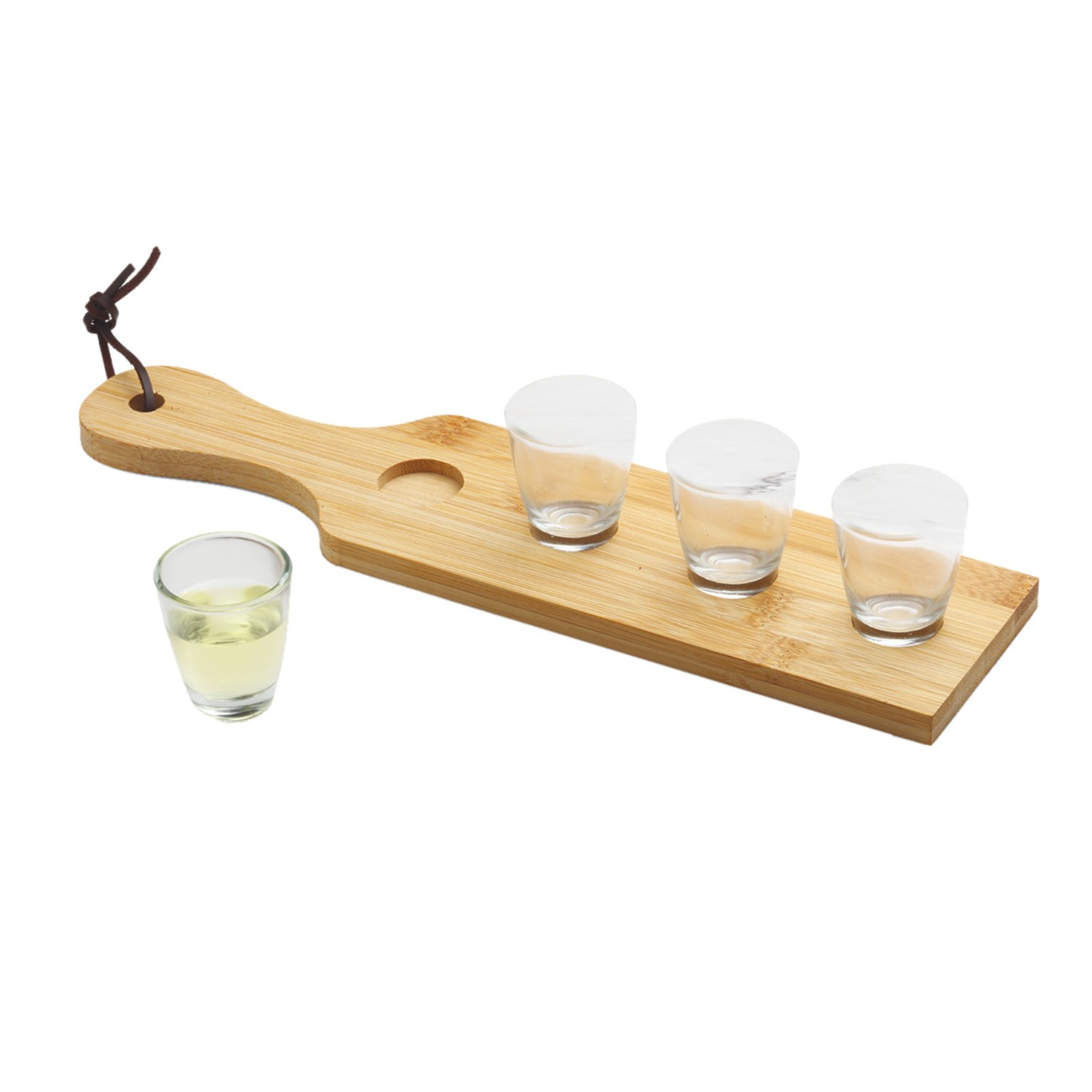 Porta bicchierini in bamboo con 4 bicchierini da 30ml in vetro. Confezione in astuccio. Dimensioni: cm 33x8x6. Imballo: 40pz.