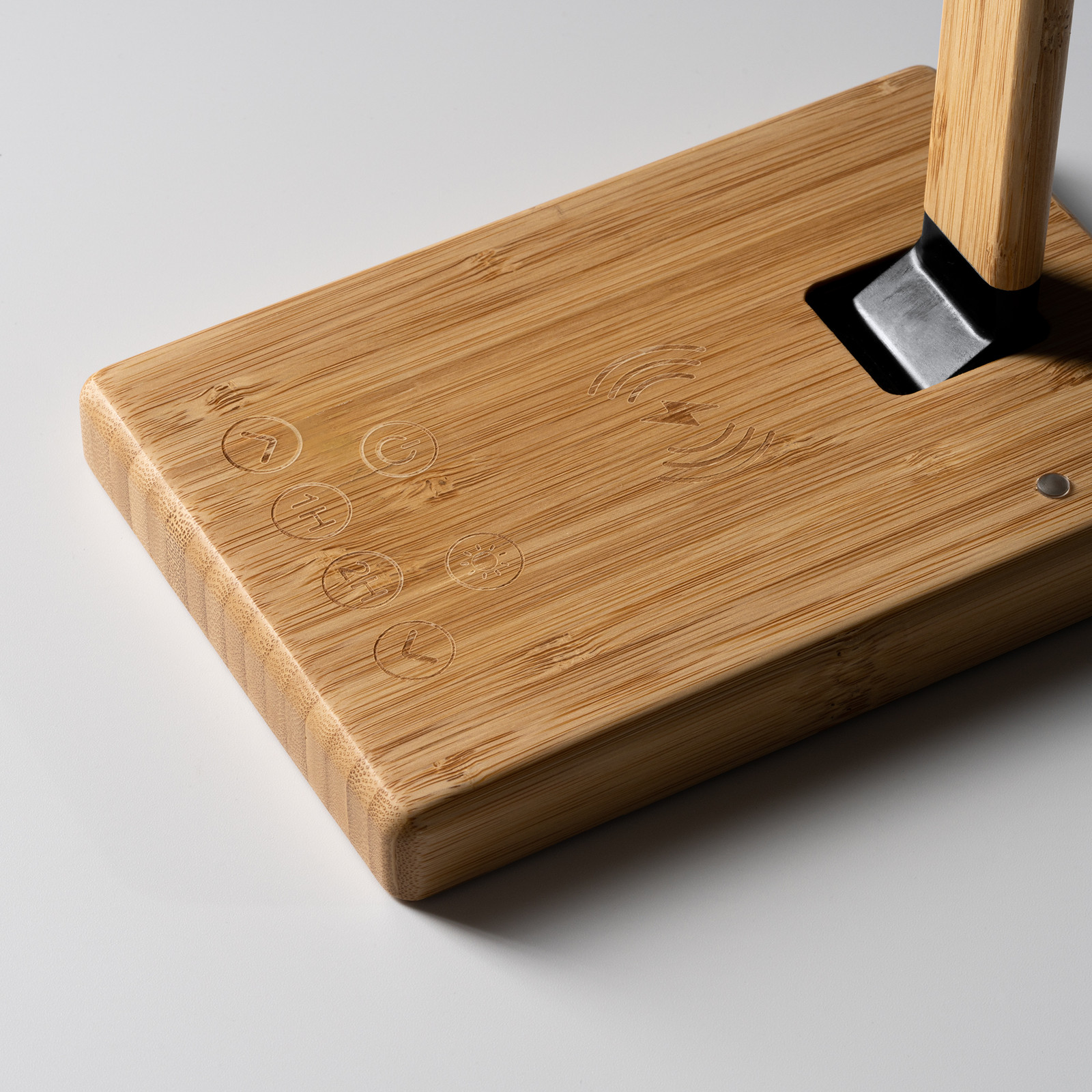 Lampada da tavolo pieghevole in bamboo con caricatore wireless integrato da 10W, 25 luci LED con 3 modalità di illuminazione e intensità, timer luce da 1 a 2 ore. Confezione in scatola eco design. Dimensioni: cm 11x38,5x24,5. Imballo: 20pz.