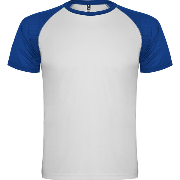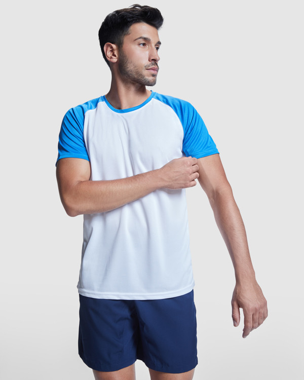 T shirt sportiva manica corta taglio raglan. Girocollo in contrasto con cuciture di rinforzo.