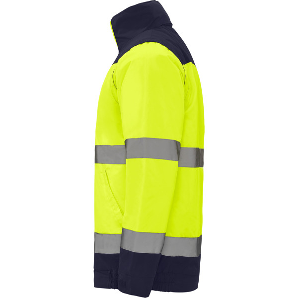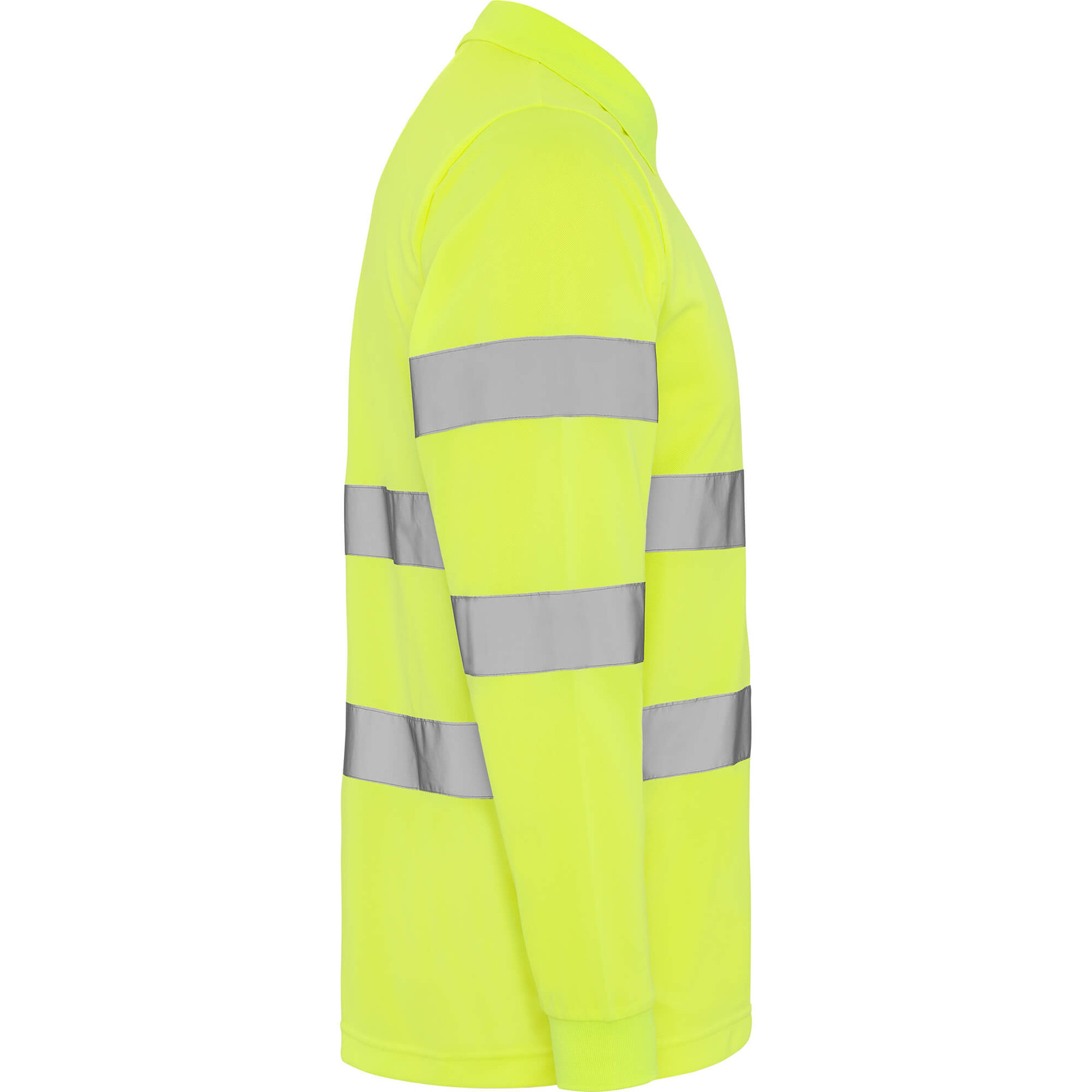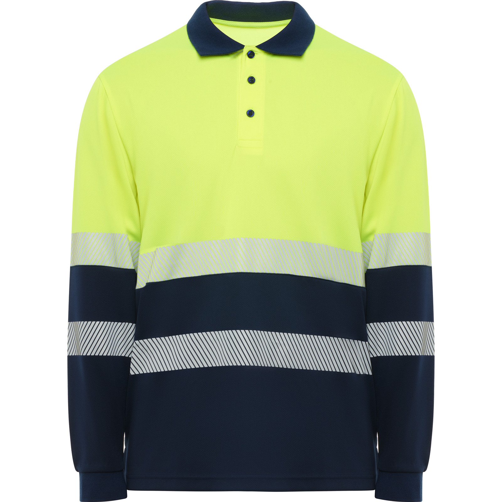 Polo tecnica a maniche lunghe ad alta visibilità. Colletto in maglia a coste 1x1. Abbottonatura a 3 bottoni a contrasto. Due strisce riflettenti segmentate su busto e maniche. Tessuto in misto poliestere/cotone per garantire comfort e traspirabilità. Tasca opzionale.