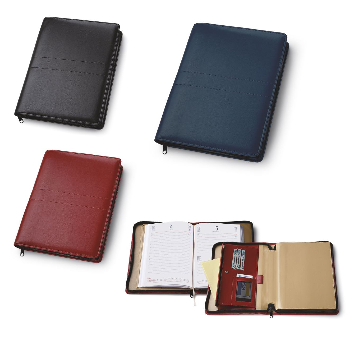 Agenda borsello in similpelle. 324 pag. Tasca interna porta documenti chiusa con bottone. Varie tasche porta card, vano porta penne. Interno mobile giornaliero (17x24). Stampa 2 colori. Multilingue. Sabato e domenica abbinati, rubrica telefonica. Colori: nero, blu. bordeaux. Confezione in astuccio. Dimensioni cm. 18x25 Imballo: 30xcolore