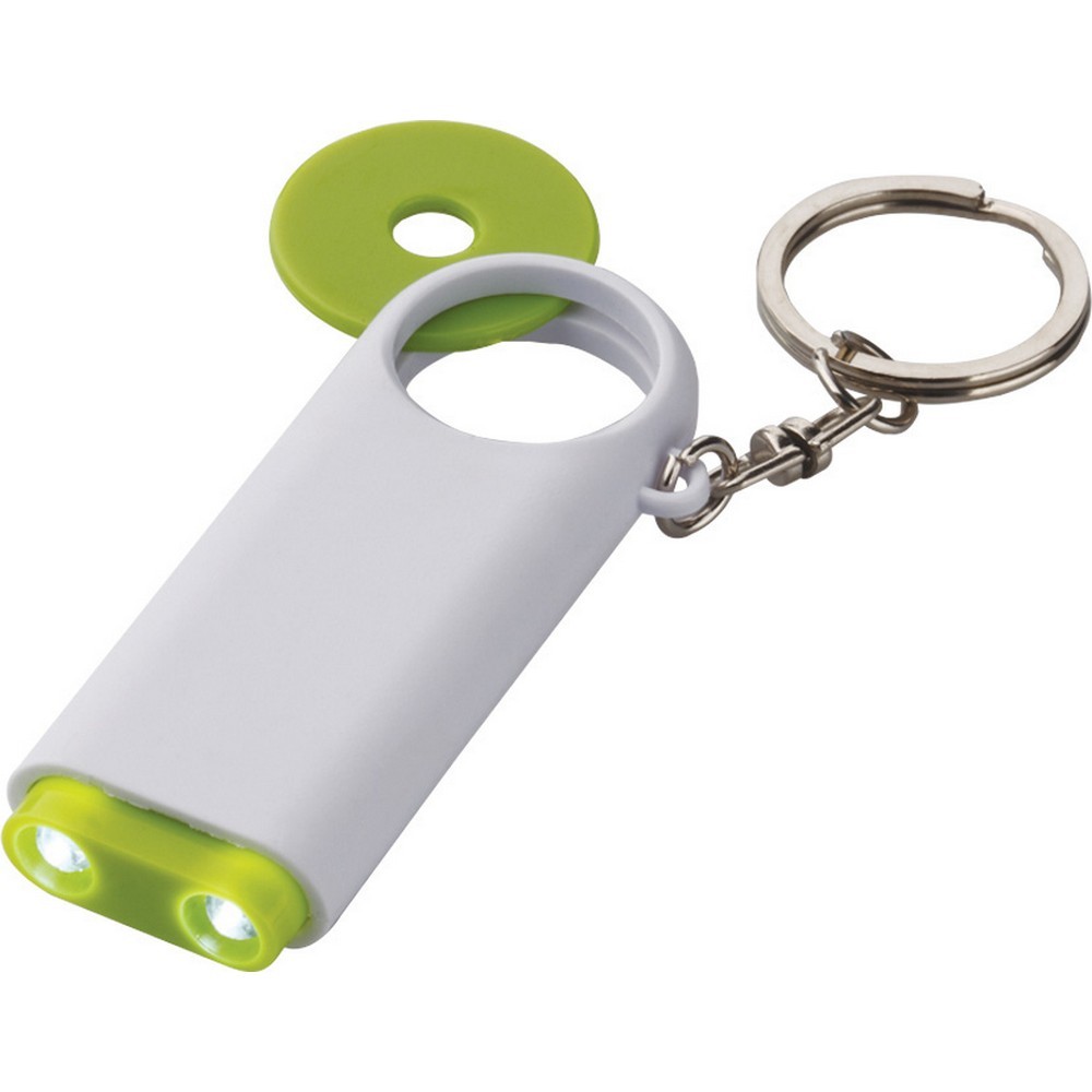 Porta chiavi-gettone con led in plastica. Confezione in polybag. Colori: rosso, blu, nero, verde, arancio, giallo. Confezione in polybag. Dimensioni cm.7x2,5 Imballo: 500xcolore