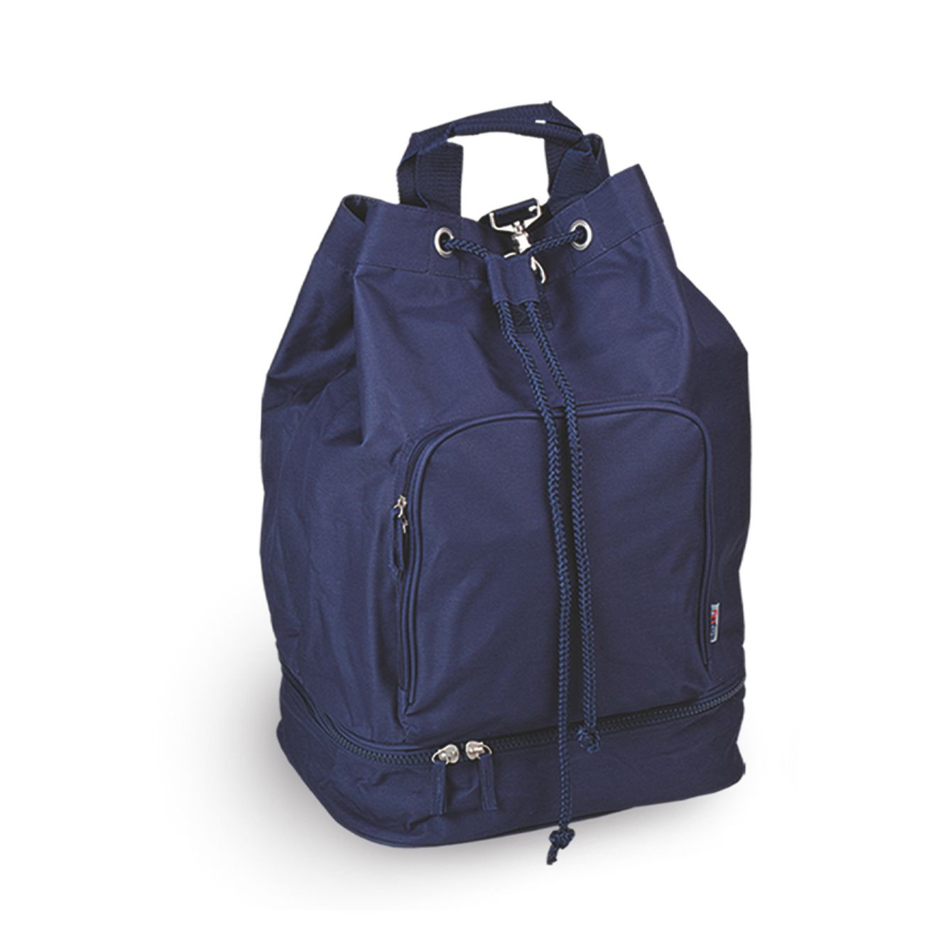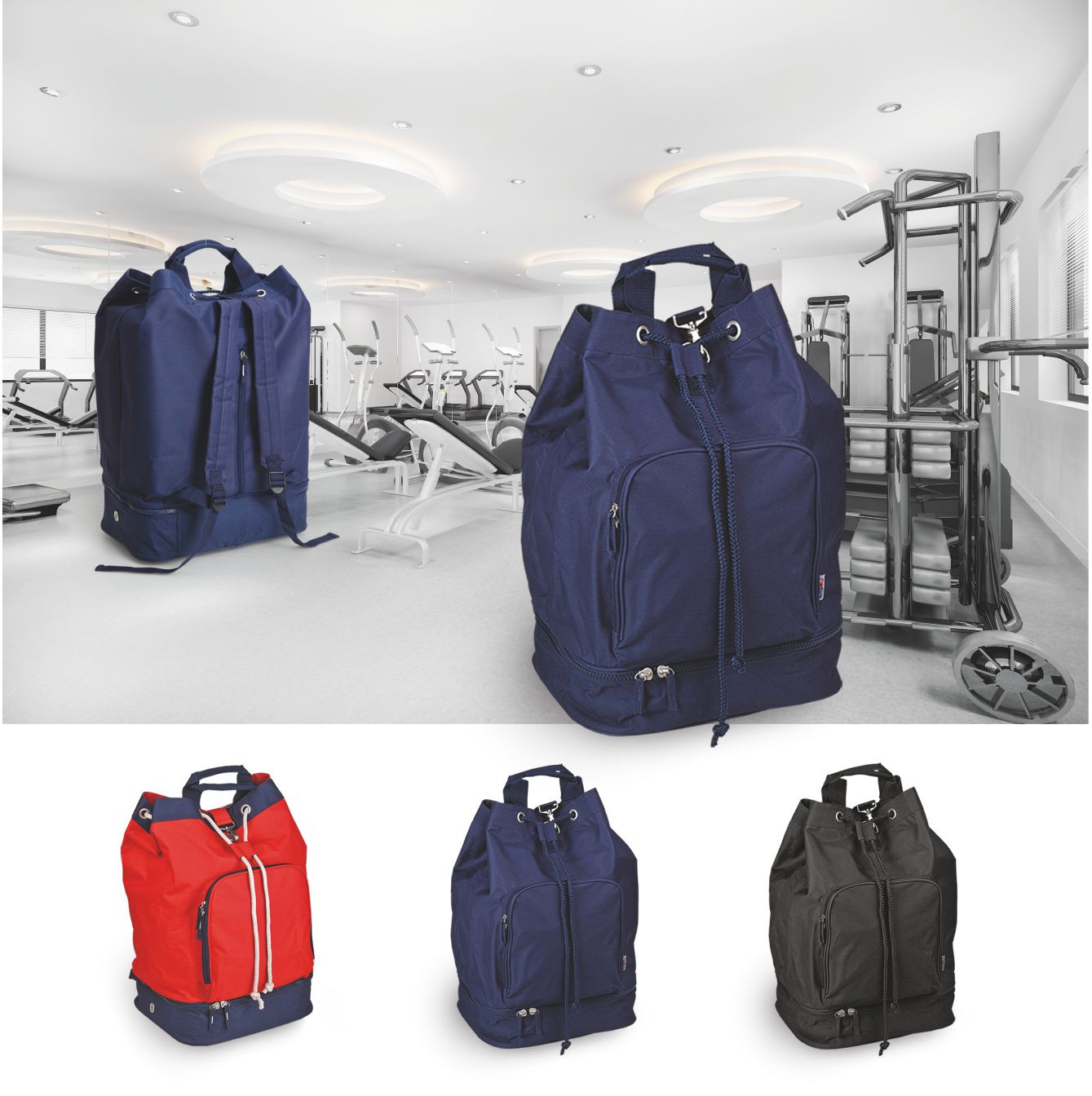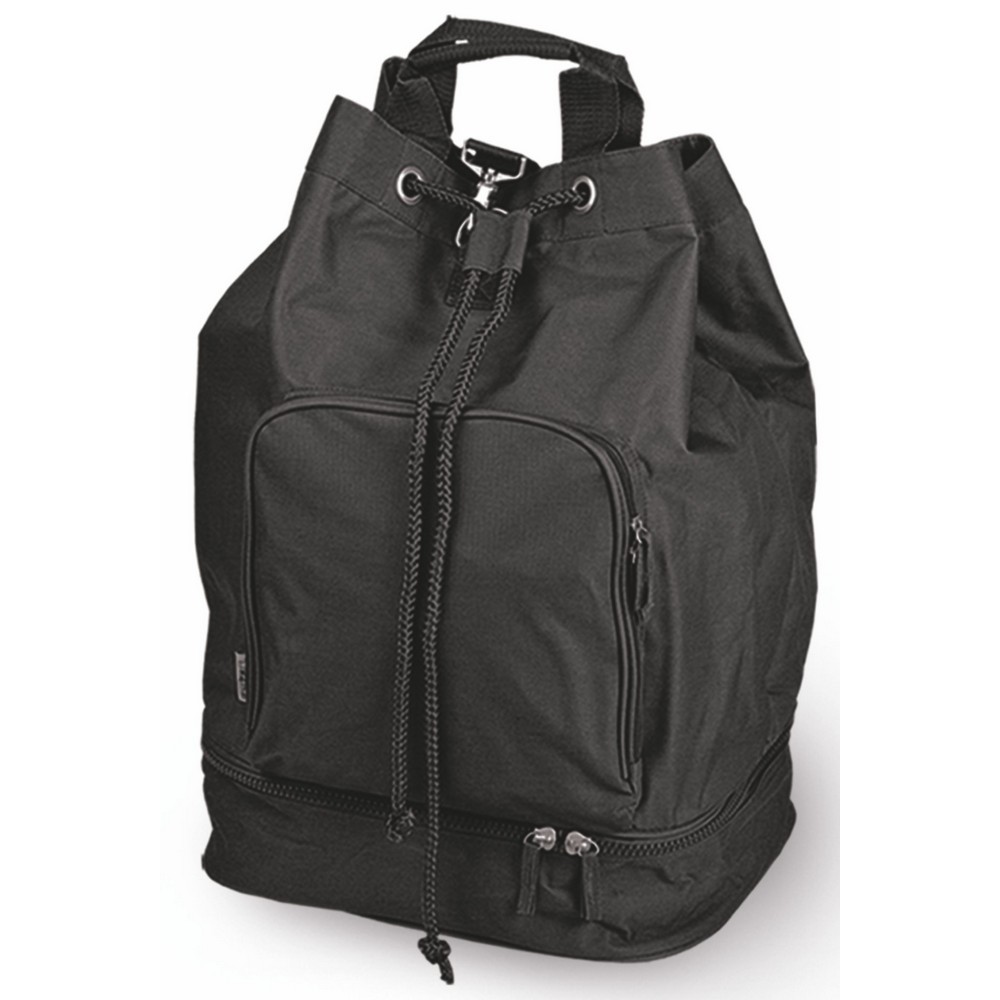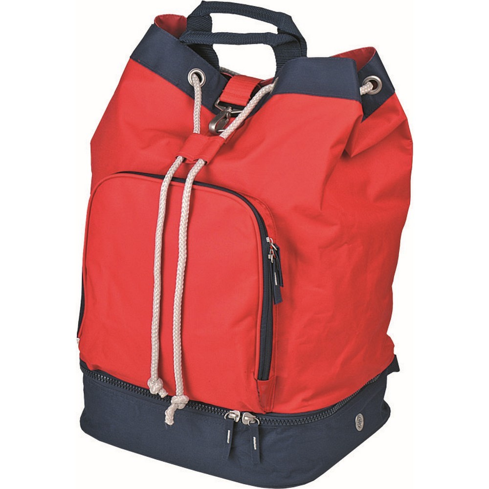 Borsa zaino in poliestere 600D.Tasca anteriore con zip. Chiusura con laccio regolabile. Corredata di manici e tracolle salva spalle, piedini antiscivolo, fondo con zip. Confezione in polybag. Colori: blu, nero, rosso, verde, fuxia. Dimensioni cm 36x53x25 Imballo: 20xcolore