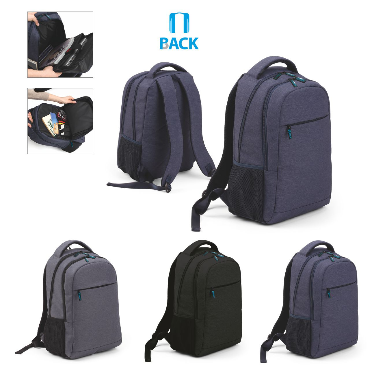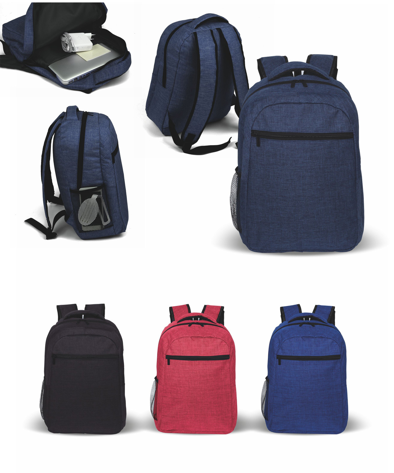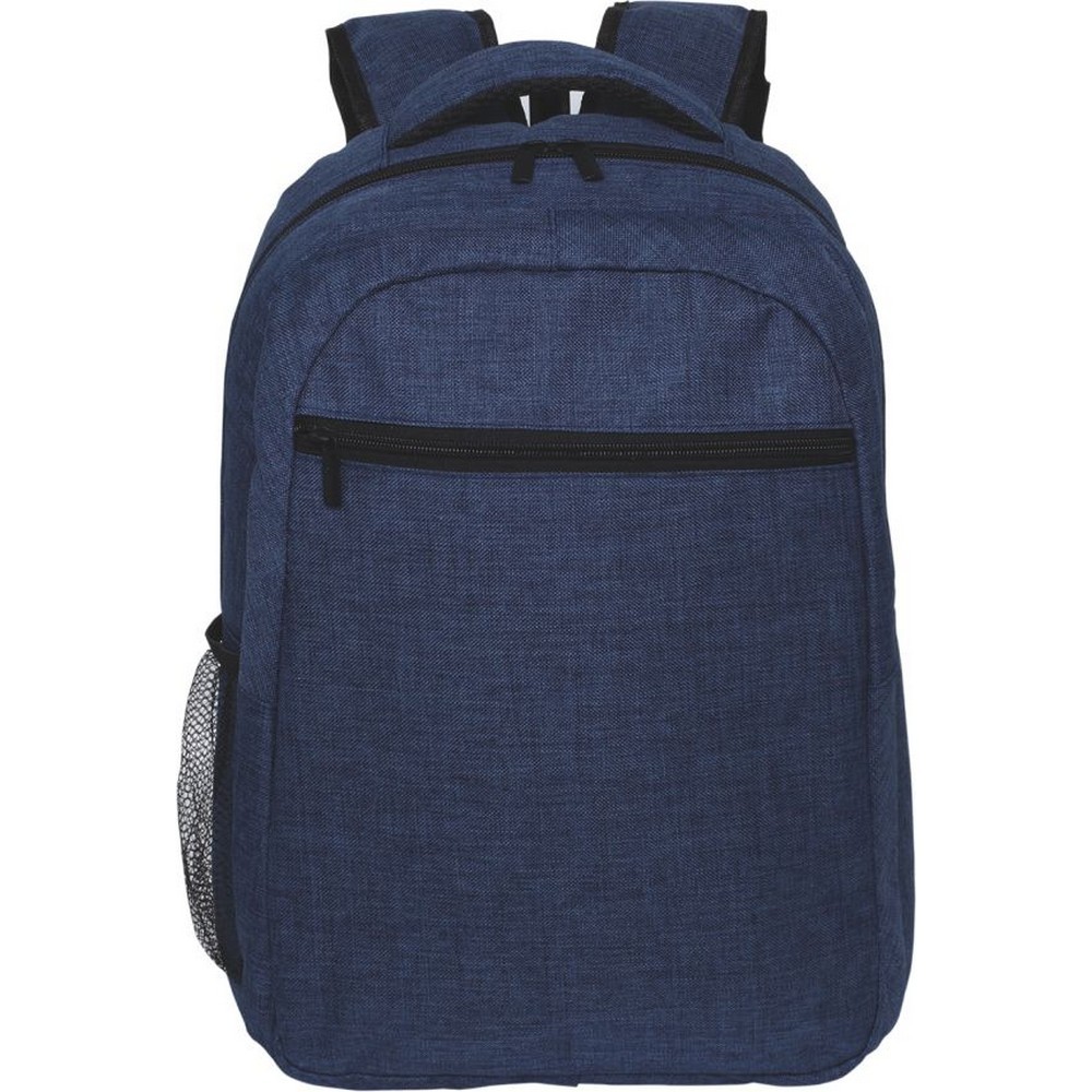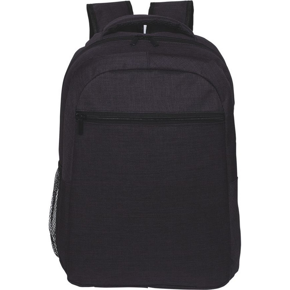 Zaino poliestere 600D. Schienale imbottito, spallacci regolabili salvaspalle. Tasca frontale con zip. Tasca laterale in rete mesh. Ampia tasca interna imbottita. Confezione in polybag. Colori: rosso, blu, nero, royal. Dimensioni cm. 31x41x15 Imballo: 25xcolore