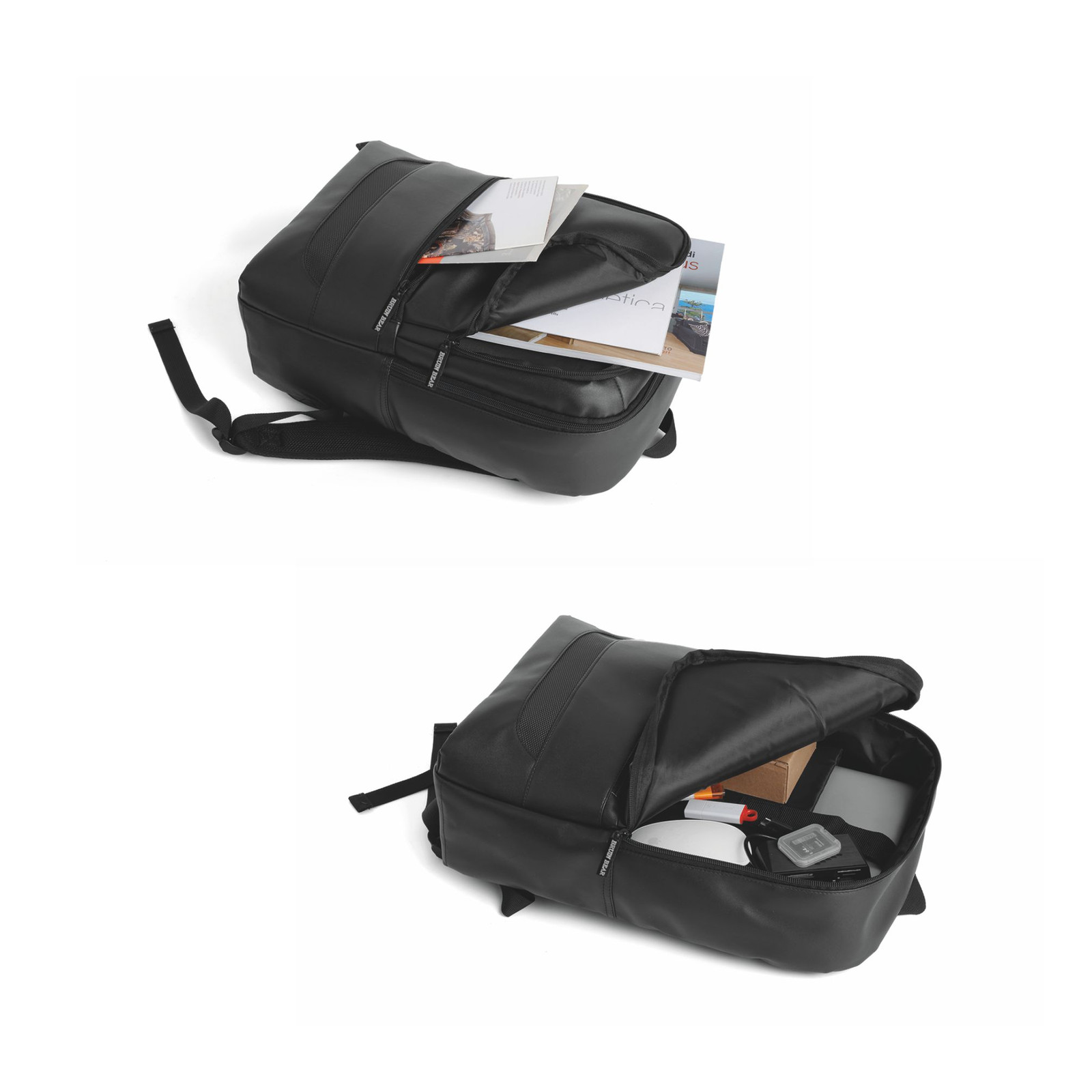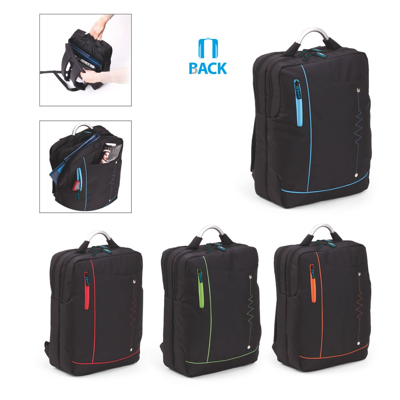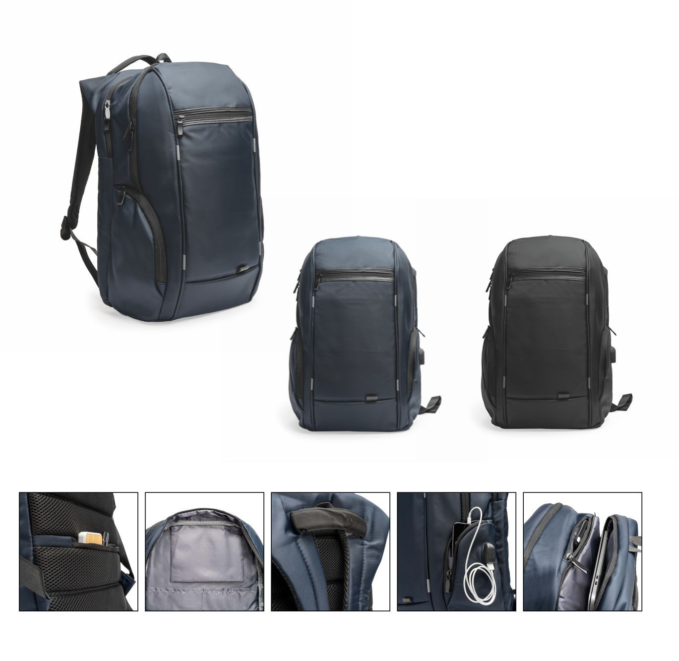 Zaino poliestere 600D. Schienale imbottito, spallacci regolabili salvaspalle. Tasca frontale con zip. Tasca laterale in rete mesh. Ampia tasca interna imbottita. Confezione in polybag. Colori: rosso, blu, nero, royal. Dimensioni cm. 31x41x15 Imballo: 25xcolore