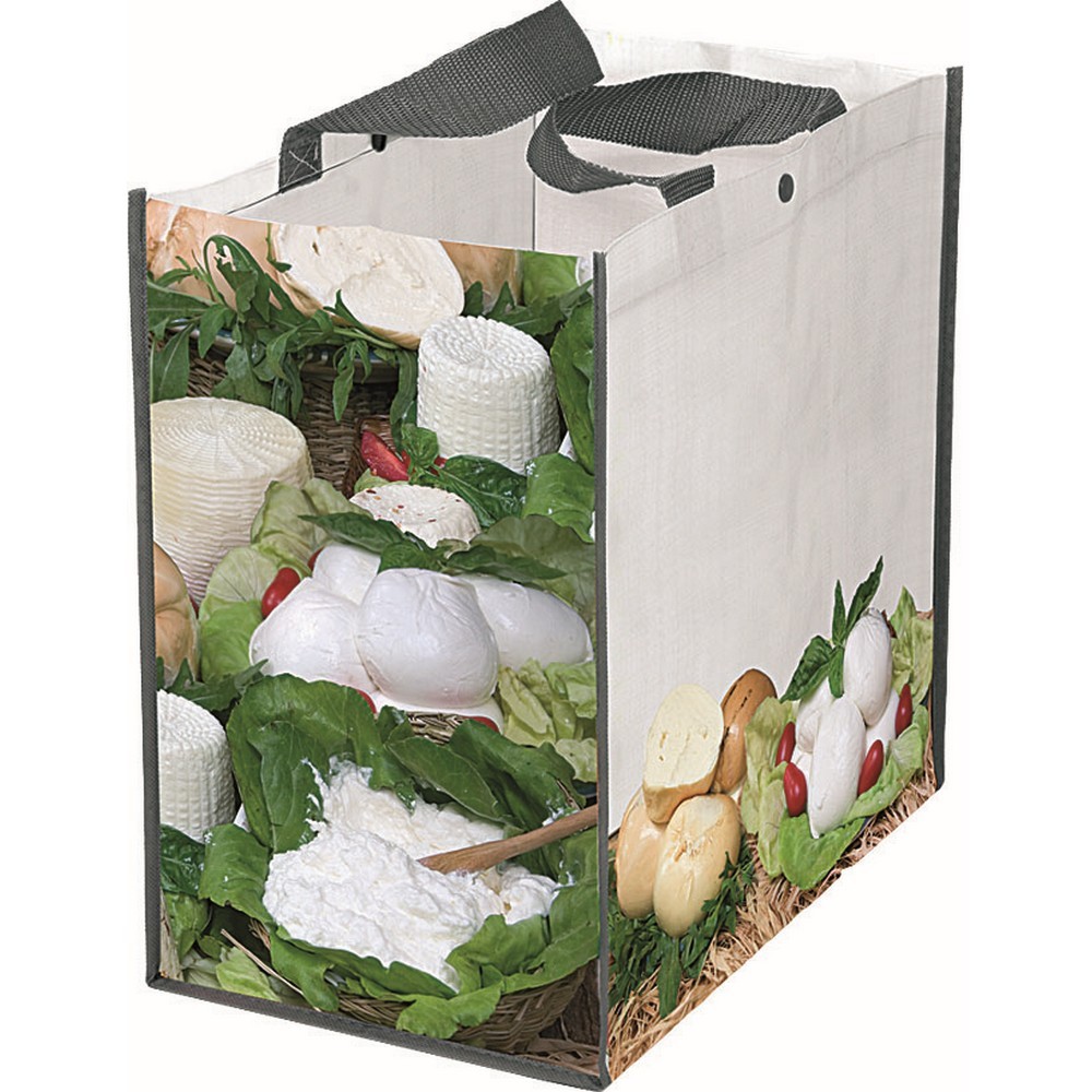Borsa shopping PP “Formaggi”. Doppio manico. Chiusura con bottoncino. Colore unico. Dimensioni cm.35x35x22 Imballo: 100