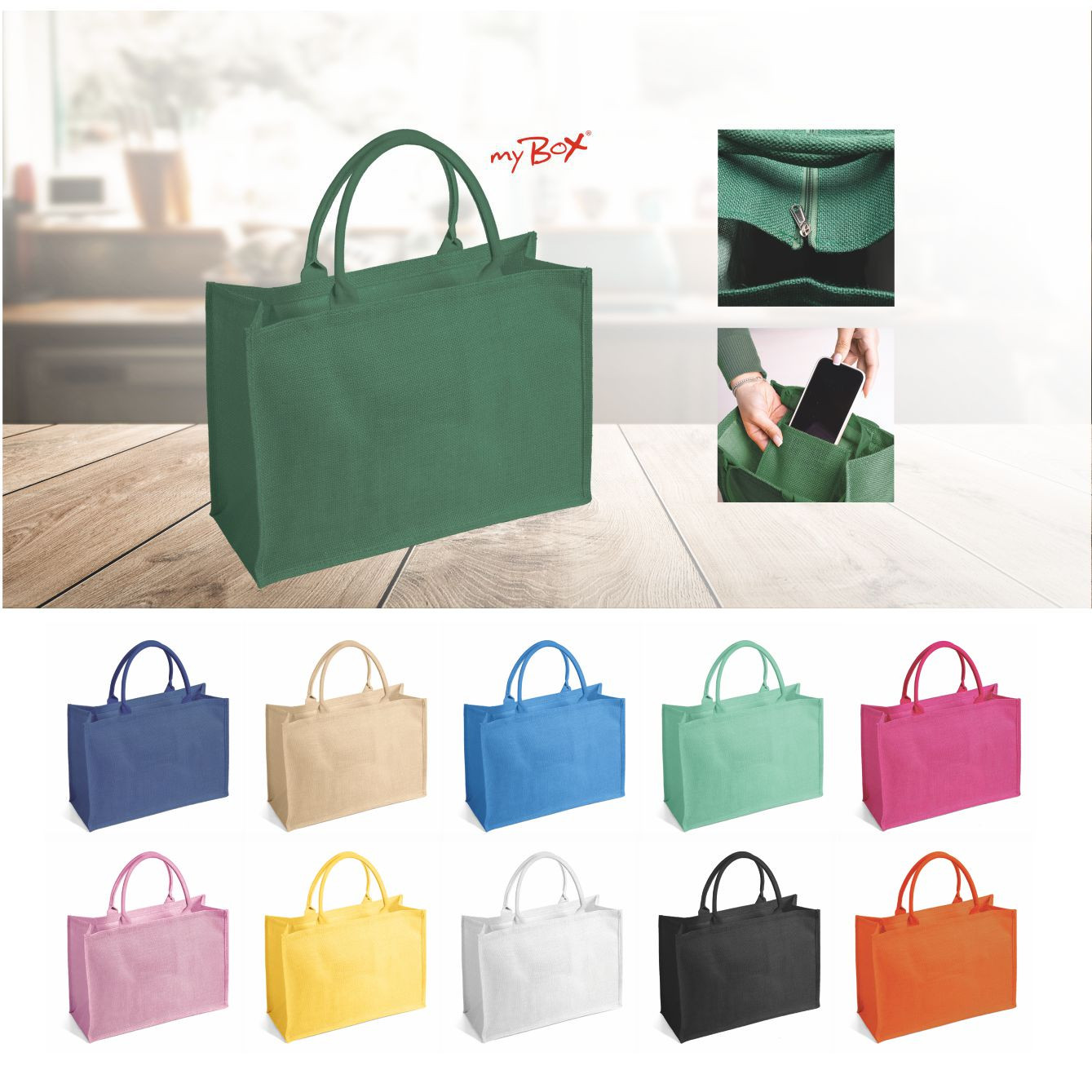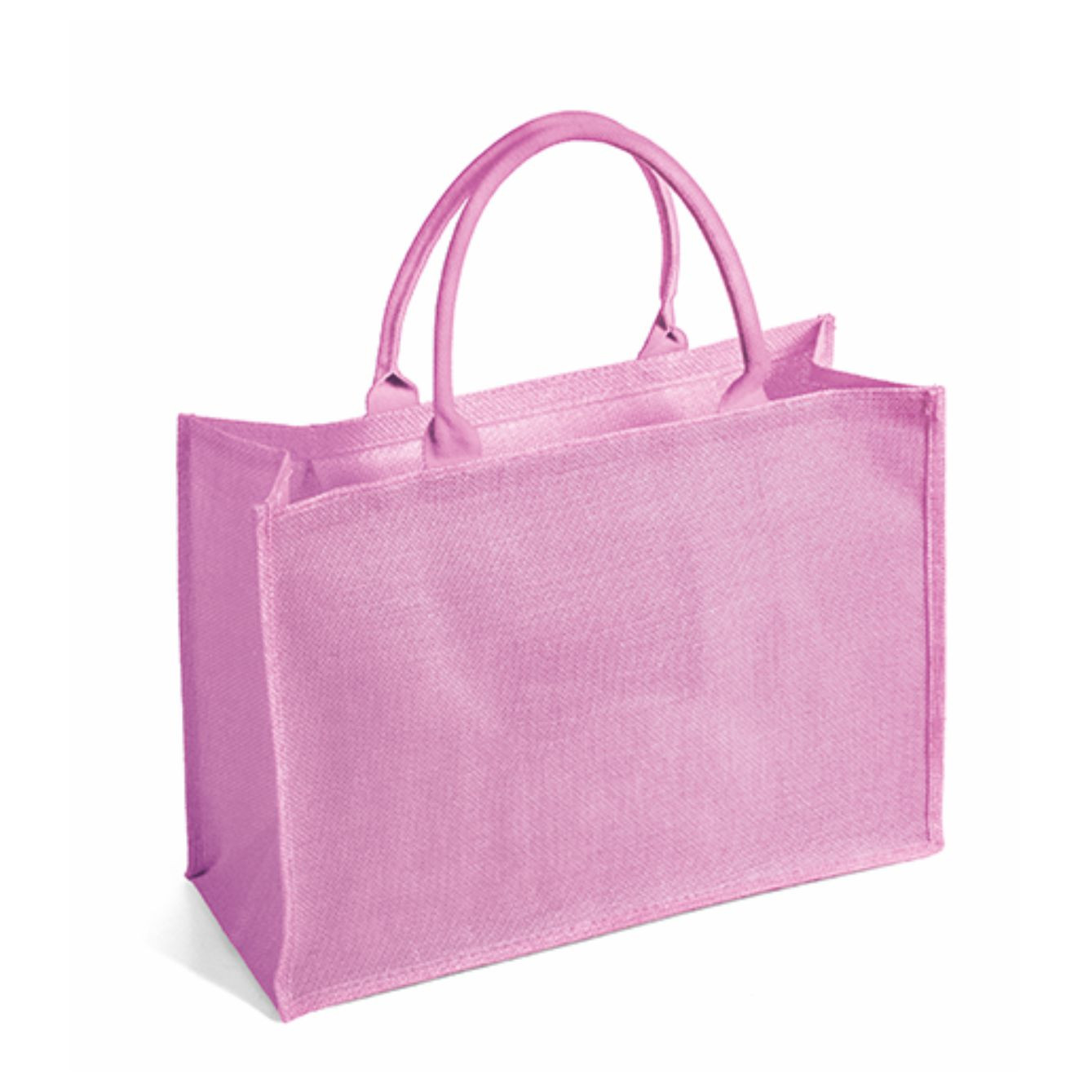 Borsa in juta tinta laminata con manici in corda da 50cm, chiusura zip e taschino interno. Dimensioni: cm 48x34x19.