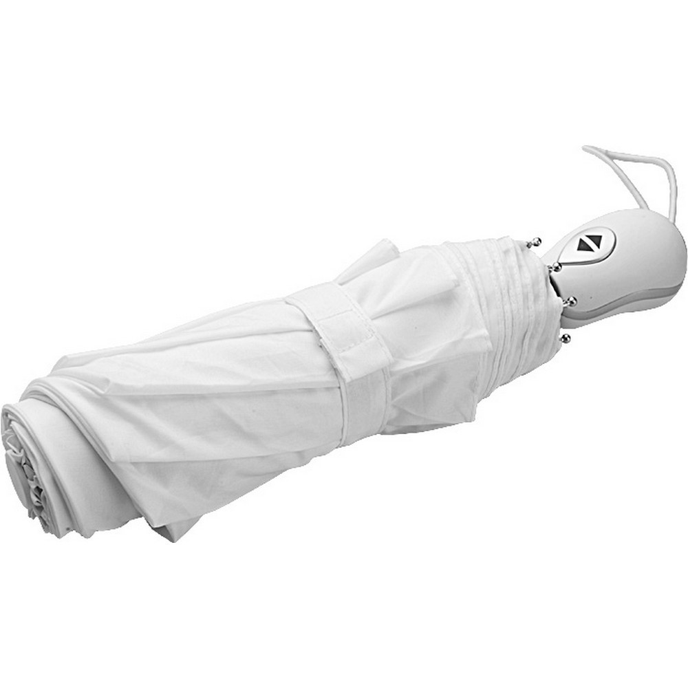 Ombrello pieghevole in poliestere 190T + pongee. Manico in plastica con pulsante automatico per facile apertura e chiusura. Confezione in custodia poliestere.8 stecche fiberglass. Colori: blu, bianco, nero. Dimensioni Ǿ cm.97 h.cm.56 Imballo: 48xcolore