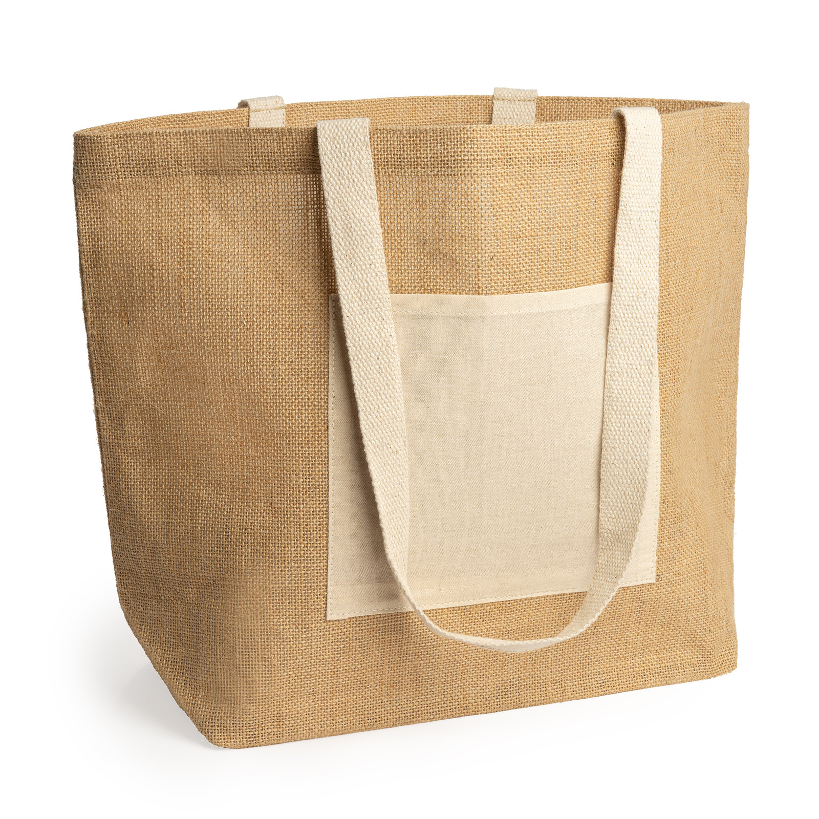 Borsa in juta laminata con tasca frontale e manici lunghi in cotone naturale. Dimansioni: cm 48x35x15. Imballo: 80.