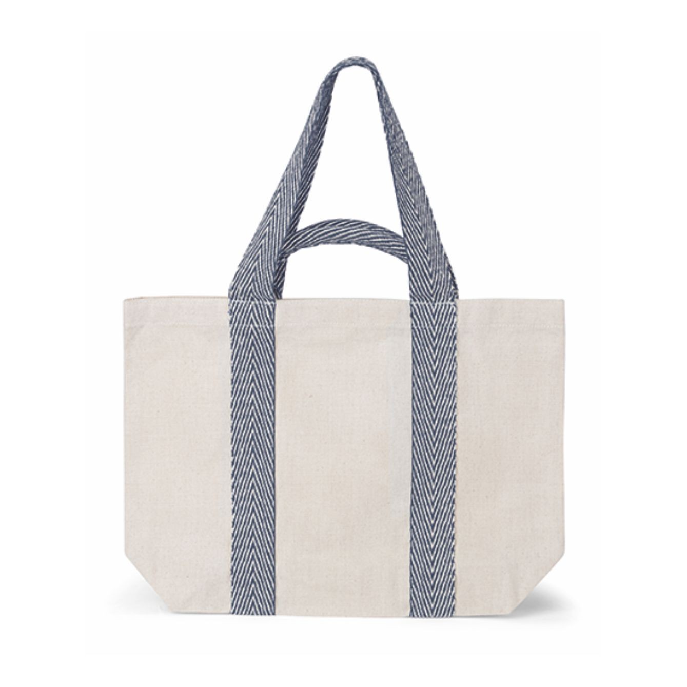 Borsa mare in natural canvas 220g/m², grafica tessita a spina di pesce solo su un lato. Manico piatto lungo cm 4x70, manico corto tubolare cm 1,5x26. Dimensioni: cm 40x28x10. Semplice, raffinata, immancabile nella tua quotidianità.