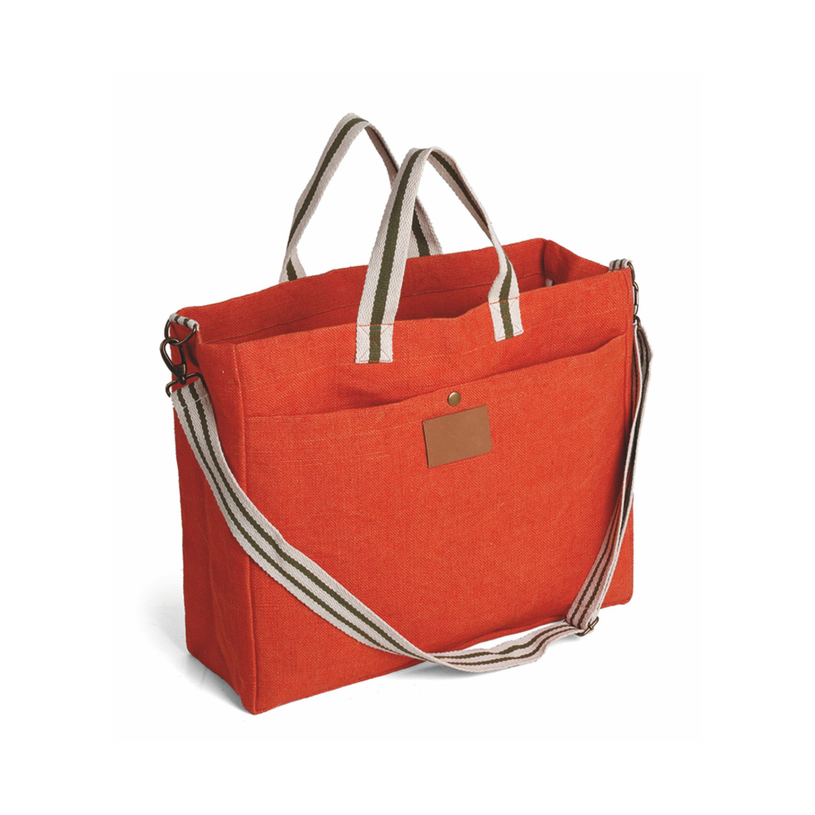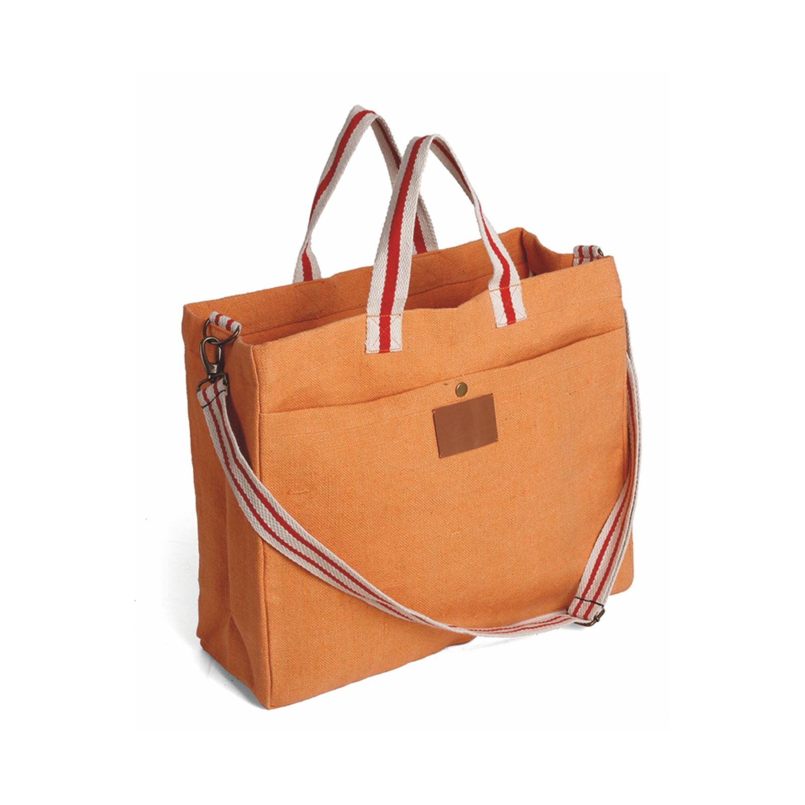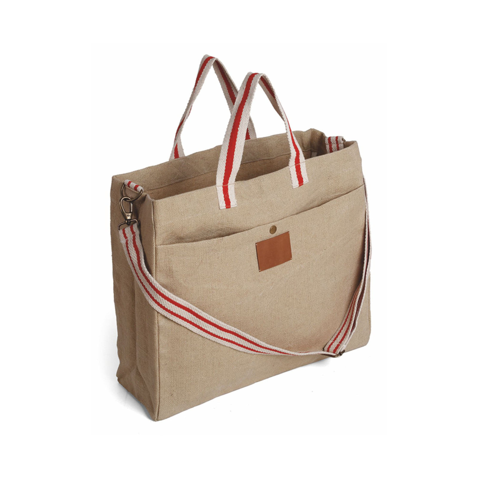 Borsa in soft juta e cotone, tasca frontale, manici in corda cm 4x48, tracolla regolabile cm 4x132. Dimensioni: cm 46x39x15. Imballo: 10pz.